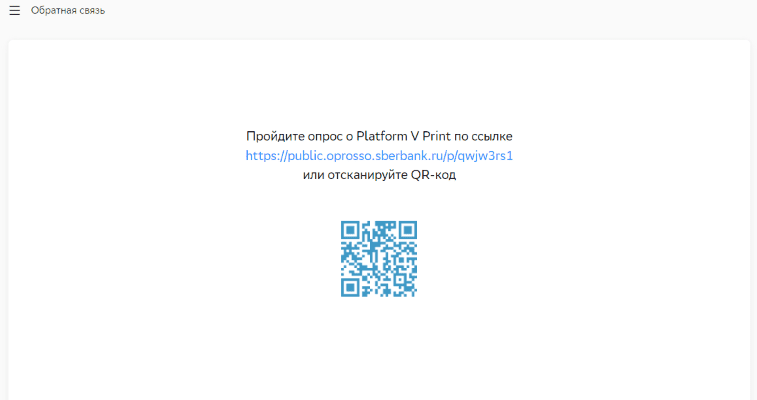 Обратная связь — в разделе меню содержится ссылка и QR-код для перехода к опросу о работе Platform V Print.