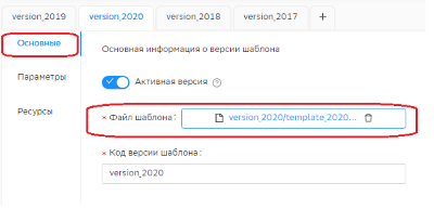 Активная версия — переключатель для выбора состояния версии шаблона. Для активной версии должен быть установлен в положение Активная версия;