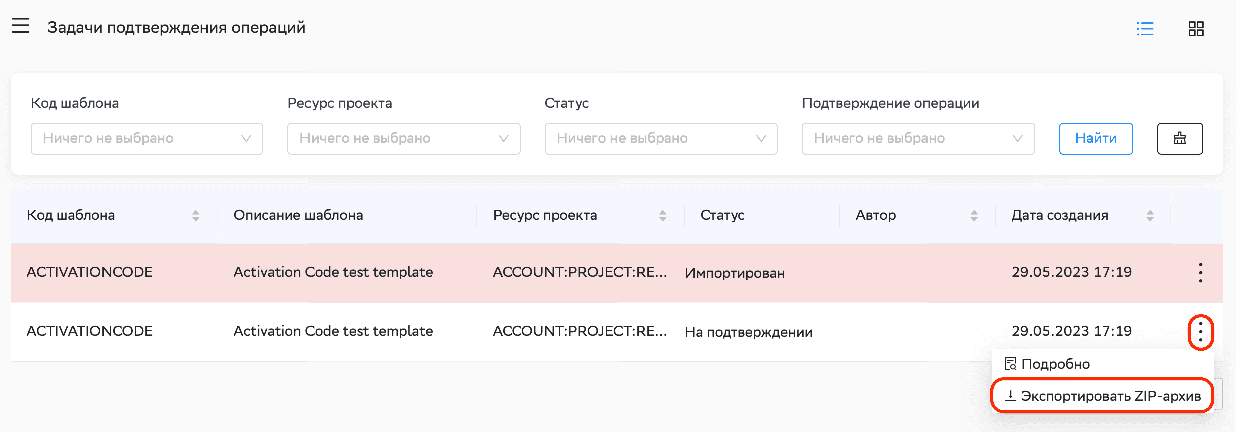 При включенной функции компонента подтверждения деструктивных операций для импорта ZIP-архив шаблона создаются задачи подтверждения операций: