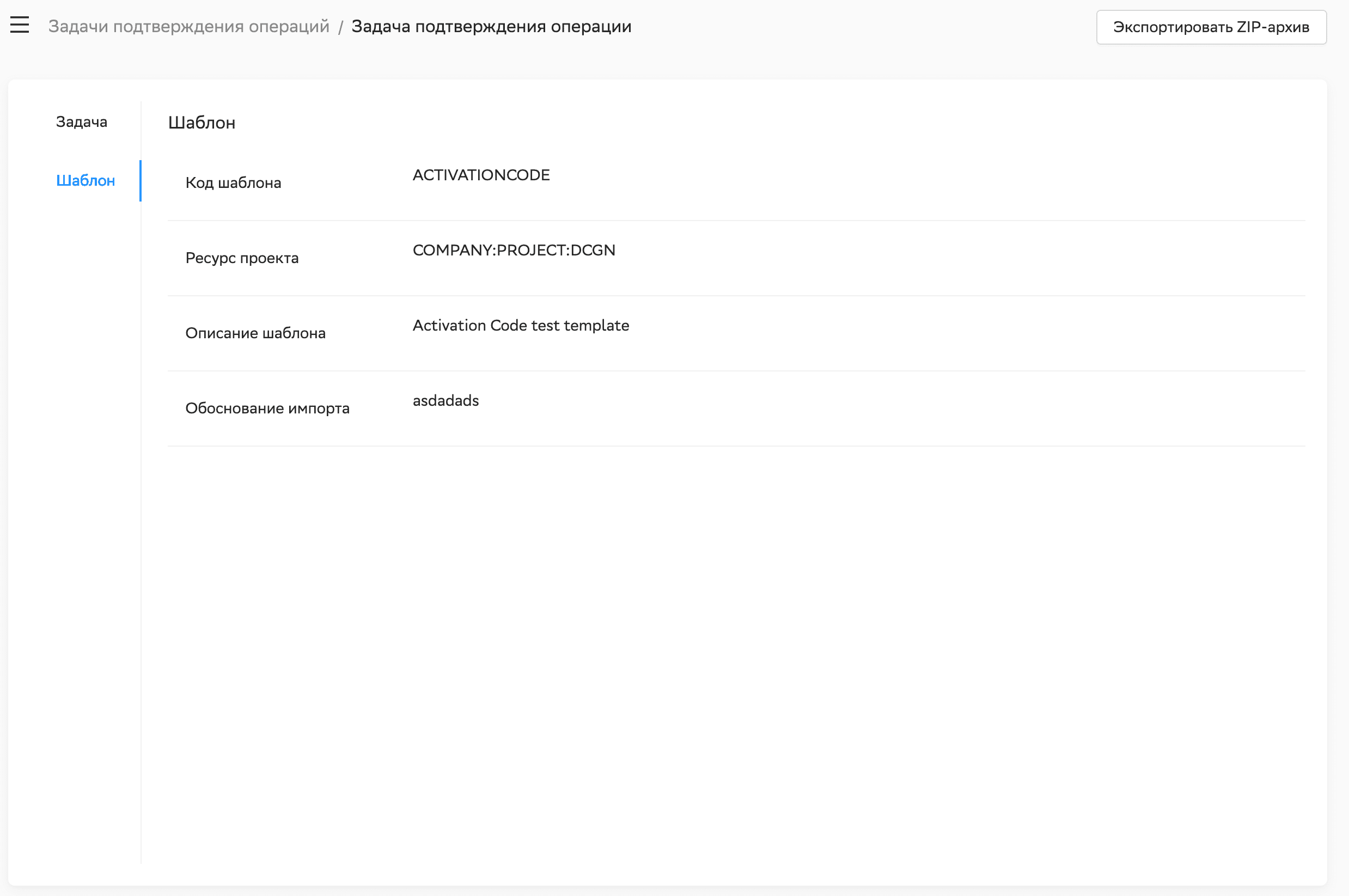 На странице Задача подтверждения операции доступен экспорт ZIP-архив шаблона документа. Для экспорта нужно нажать на кнопку Экспортировать ZIP-архив.