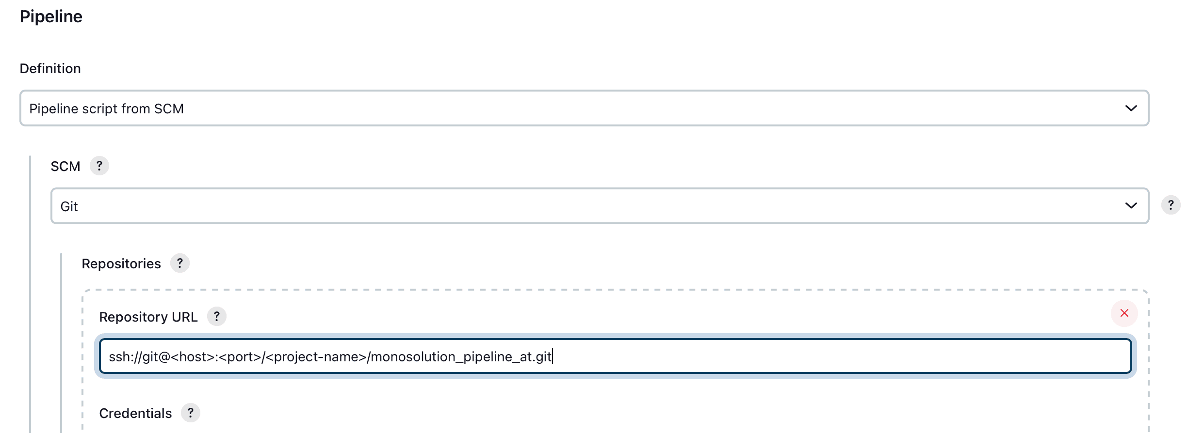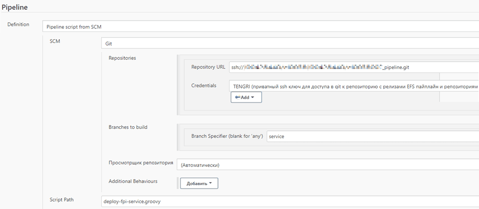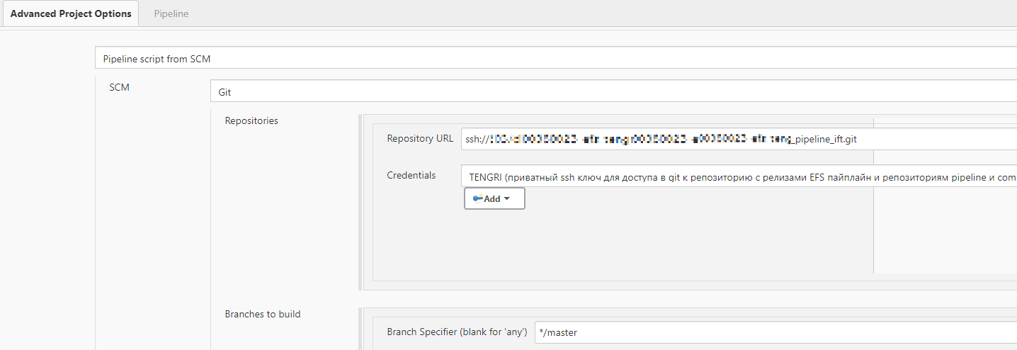 monosolution_pipeline_at— репозиторий с кодовой базой релизов pipeline (см. раздел Подготовка окружения);Credentials — созданный ранее credentials jenkins SshKeyCreds (см. раздел Подготовка окружения);