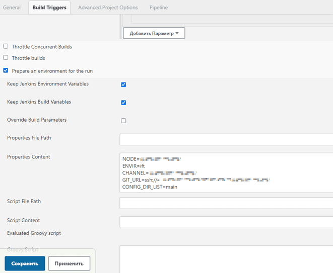 Для Deploy и ELK job проверяются: CONFIG_DIR, overrides (подробнее о параметре в инструкции), список сценариев.