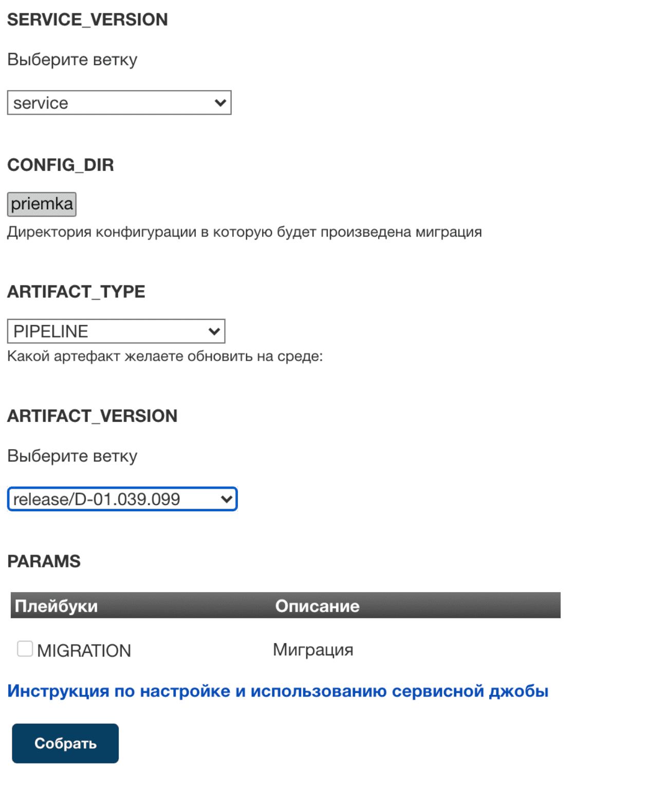 Перенастройка Service job(для запуска без параметров нажмите кнопку «Собрать») |
