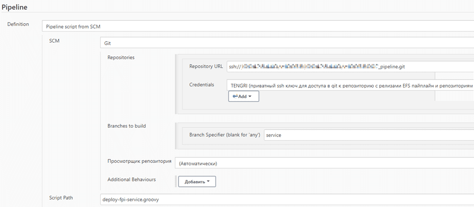 monosolution_pipeline_at— репозиторий с кодовой базой релизов pipeline (см. раздел Подготовка окружения);Credentials — созданный ранее credentials jenkins SshKeyCreds (см. раздел Подготовка окружения);