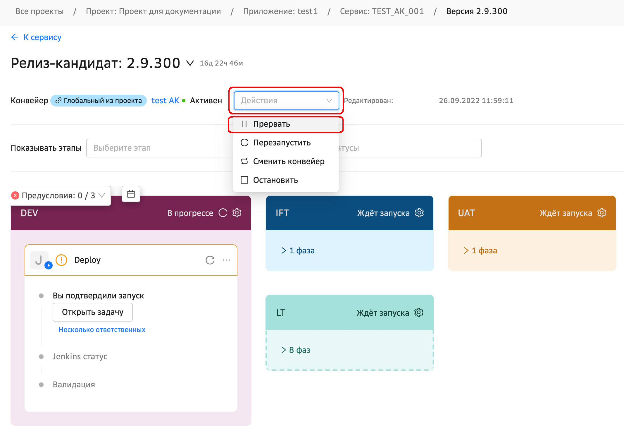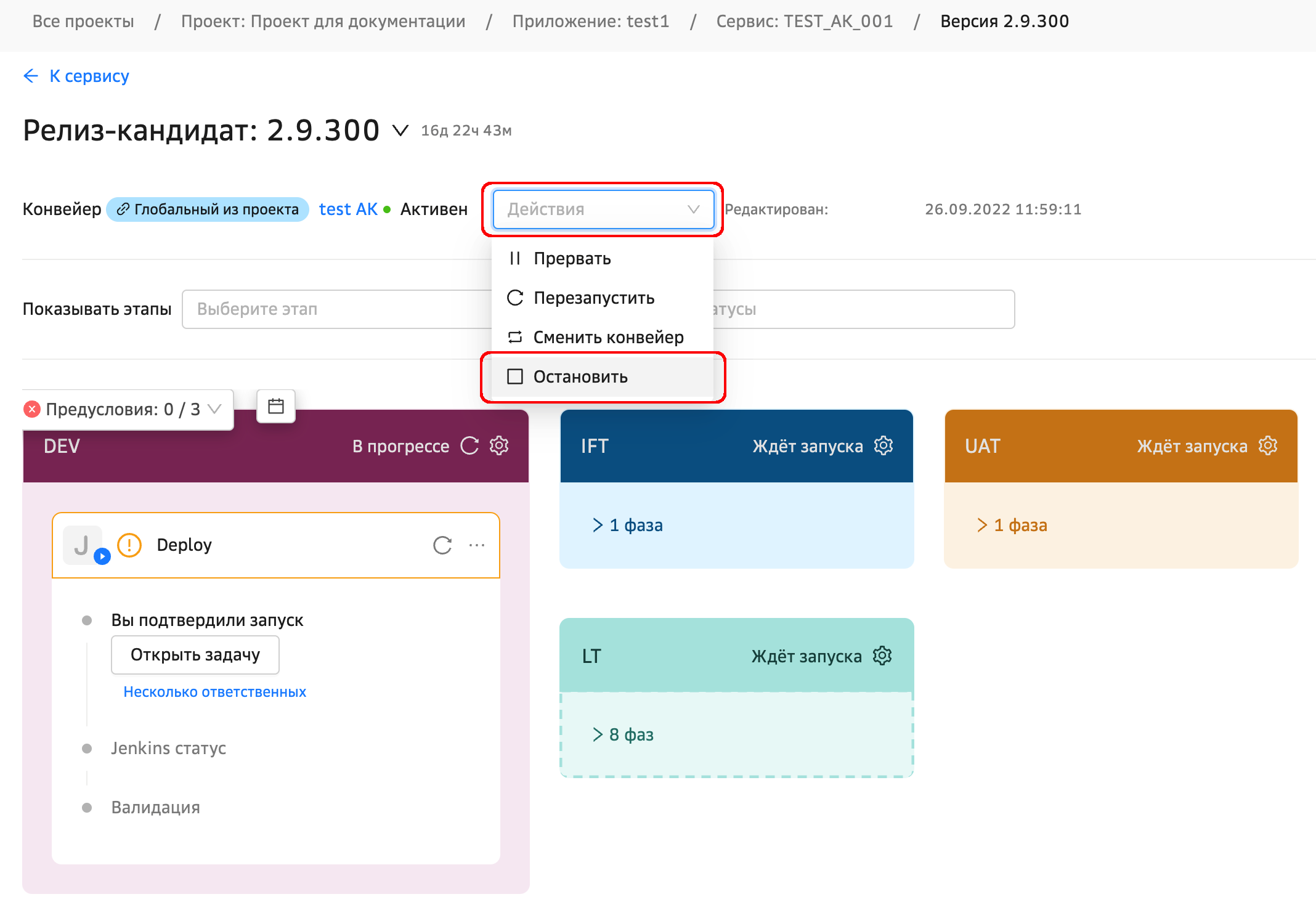 Для останова конвейера и прекращения работы с текущим запуском (например, для последующего запуска заново, или чтобы уступить очередь более позднему релиз-кандидату):