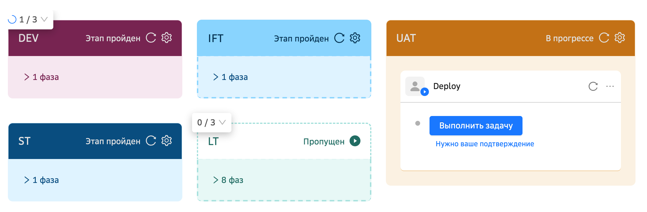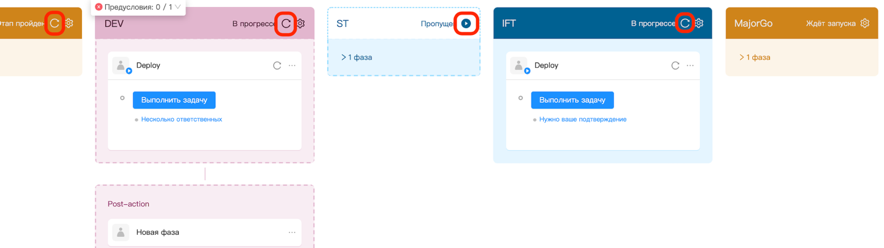 Можно перезапустить этапы, на которых отображается иконка перезапуска или старта этапа (выделены на рисунке). Отображение иконки перезапуска зависит от статуса этапа.