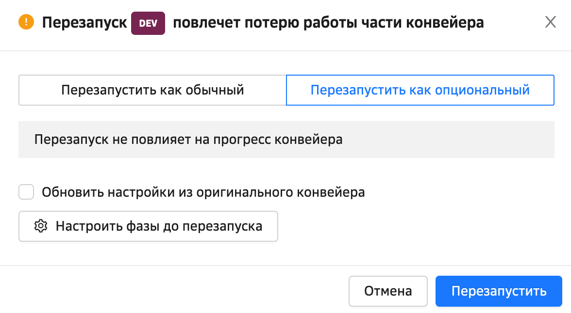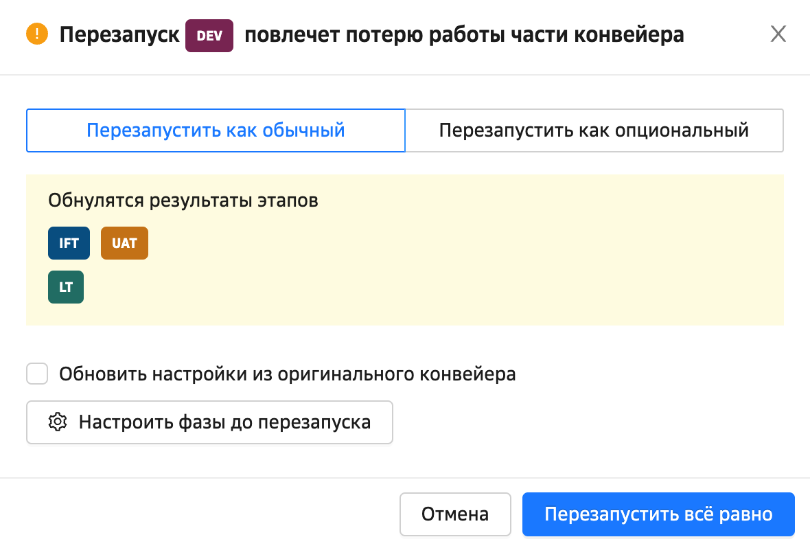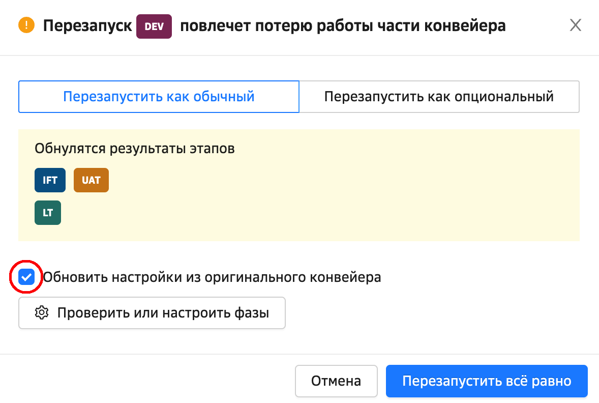 Внимание: при перезапуске этапа как обычного с включенным флажком Обновить настройки из оригинального конвейера обновляются настройки только перезапускаемого этапа, последующие этапы стартуют со старыми настройками.