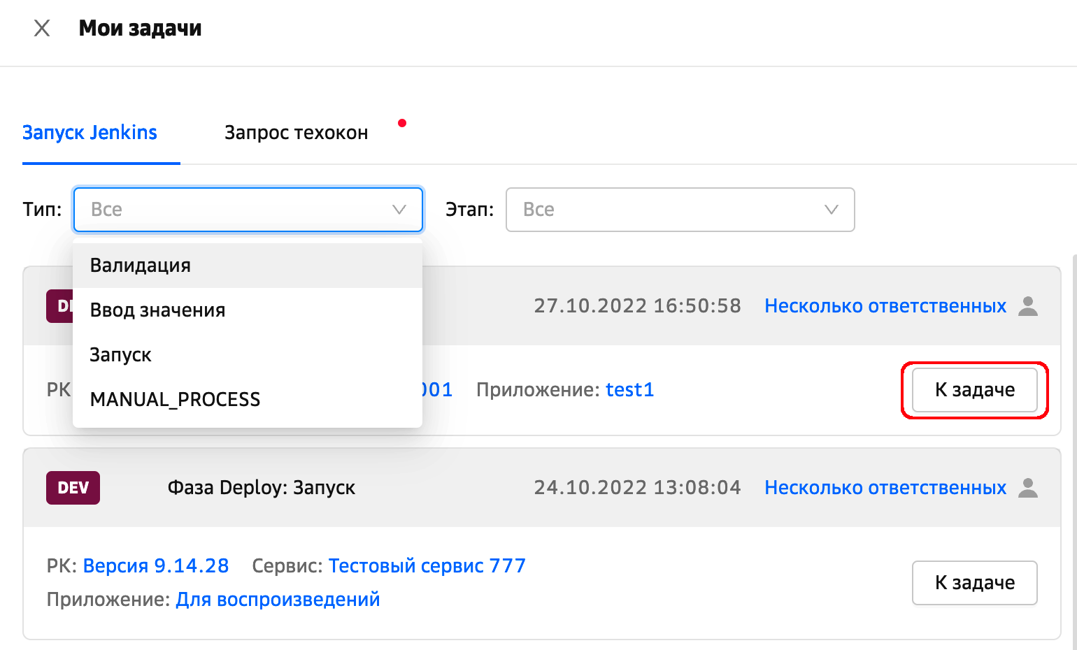 Задачи могут быть двух типов: на подтверждение запуска и на валидацию результатов выполнения задания Jenkins