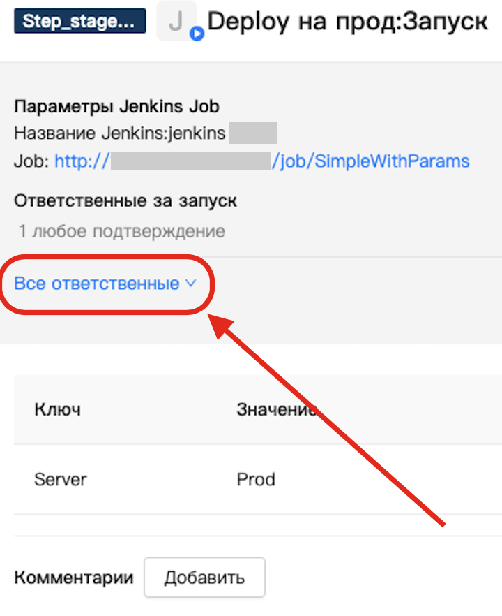 Список ответственных отображается при клике на надпись под кнопкой подтверждения/запуска