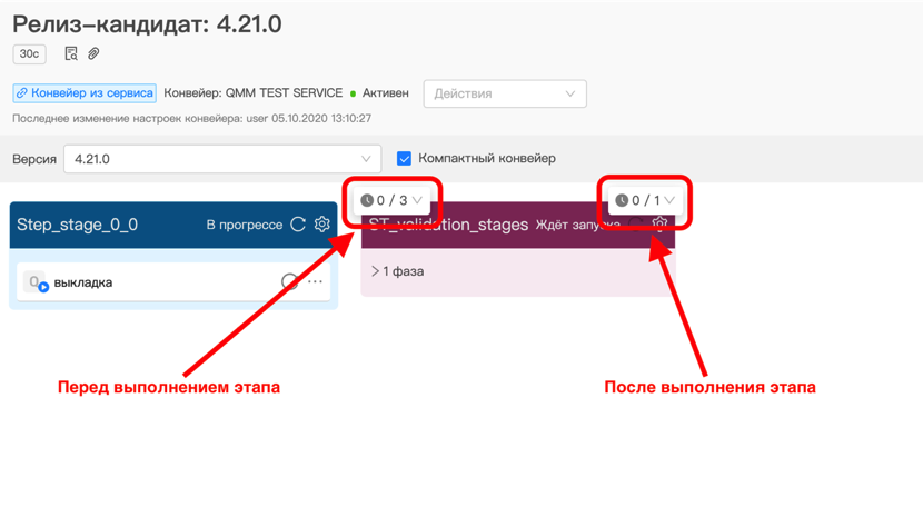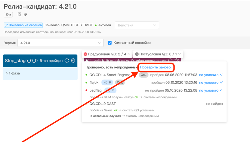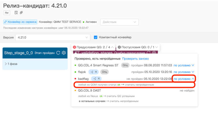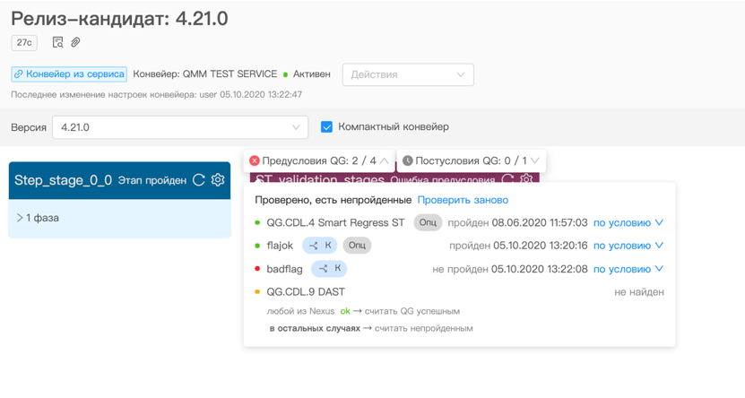 Пока этап находится в очереди на исполнение, проверка QG не осуществляется. На этом этапе можно уточнить условия прохождения проверки до и после прохождения этапа кликом по соответствующей области
