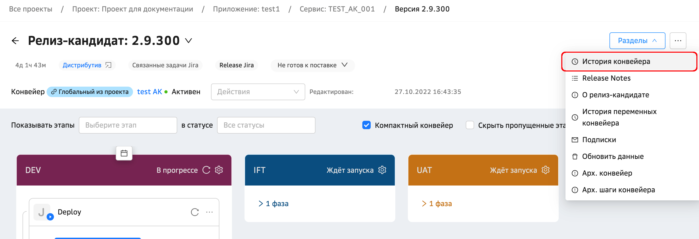 Подробнее см. в разделе "История действий в конвейере релиз-кандидата".