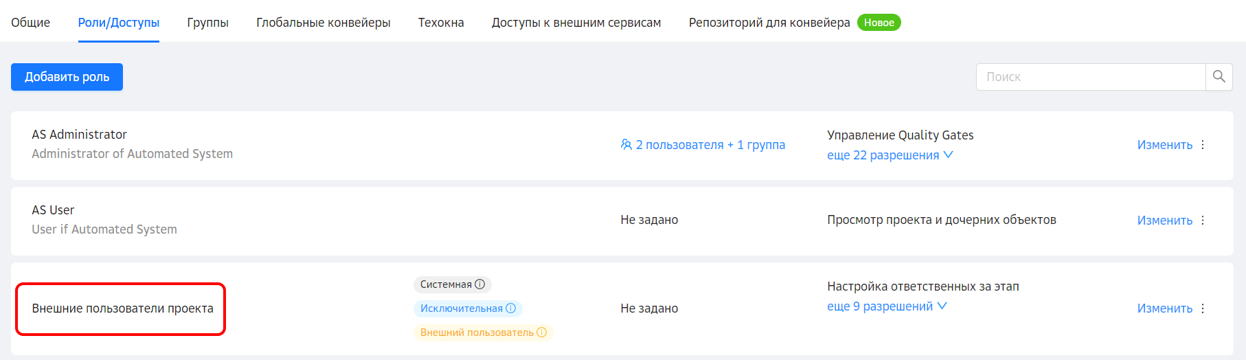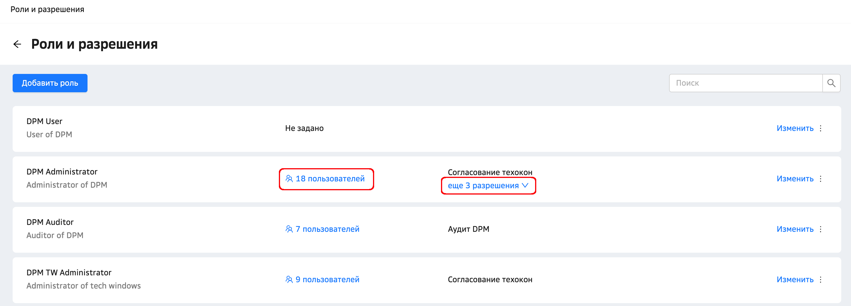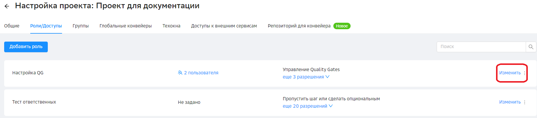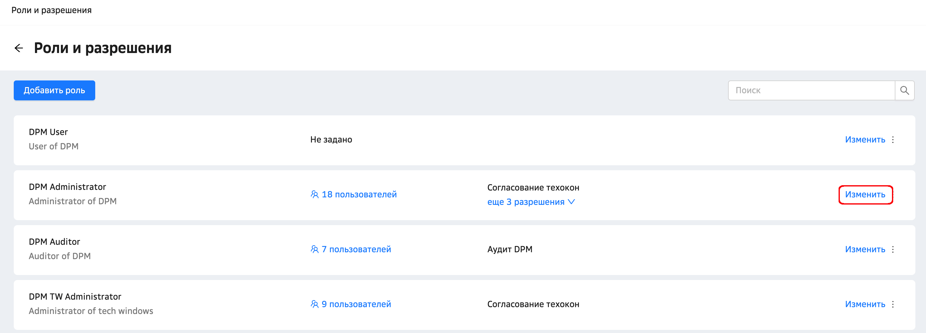 Для изменения прав и/или состава участников роли перейдите по ссылке Изменить в строке соответствующей роли.