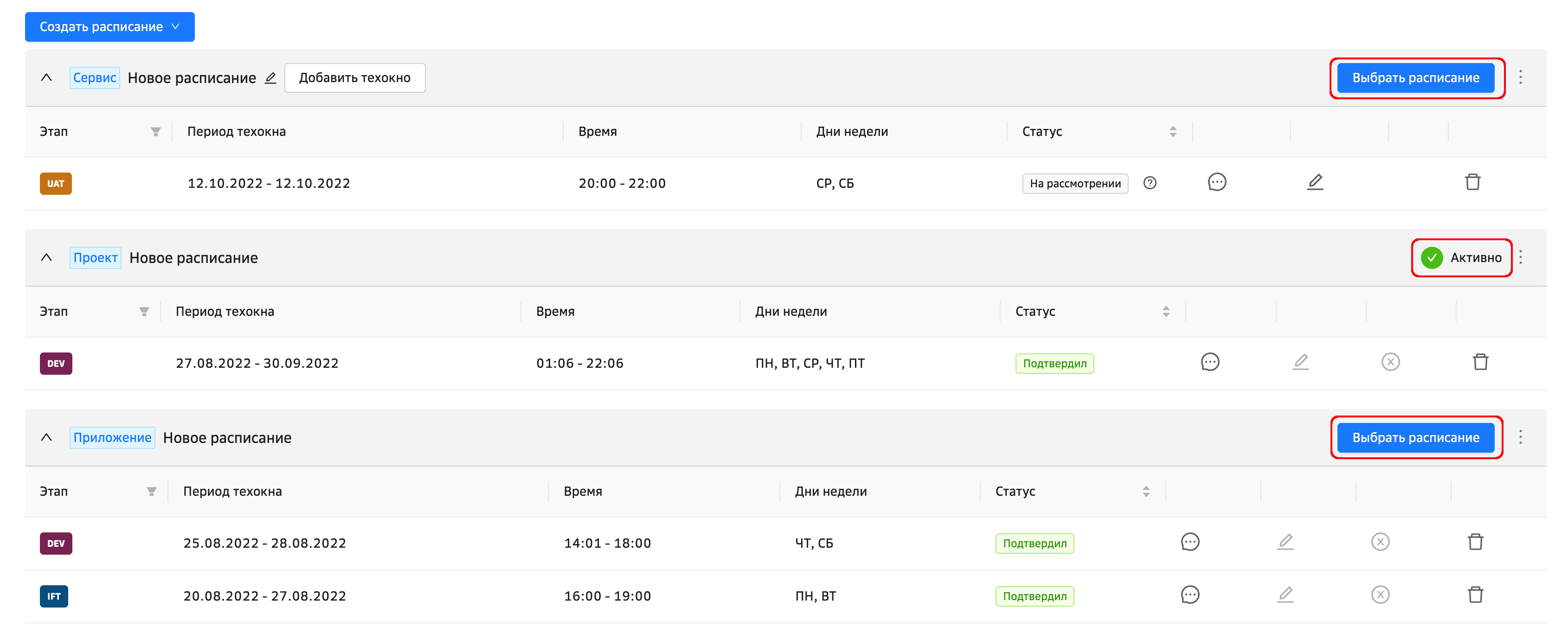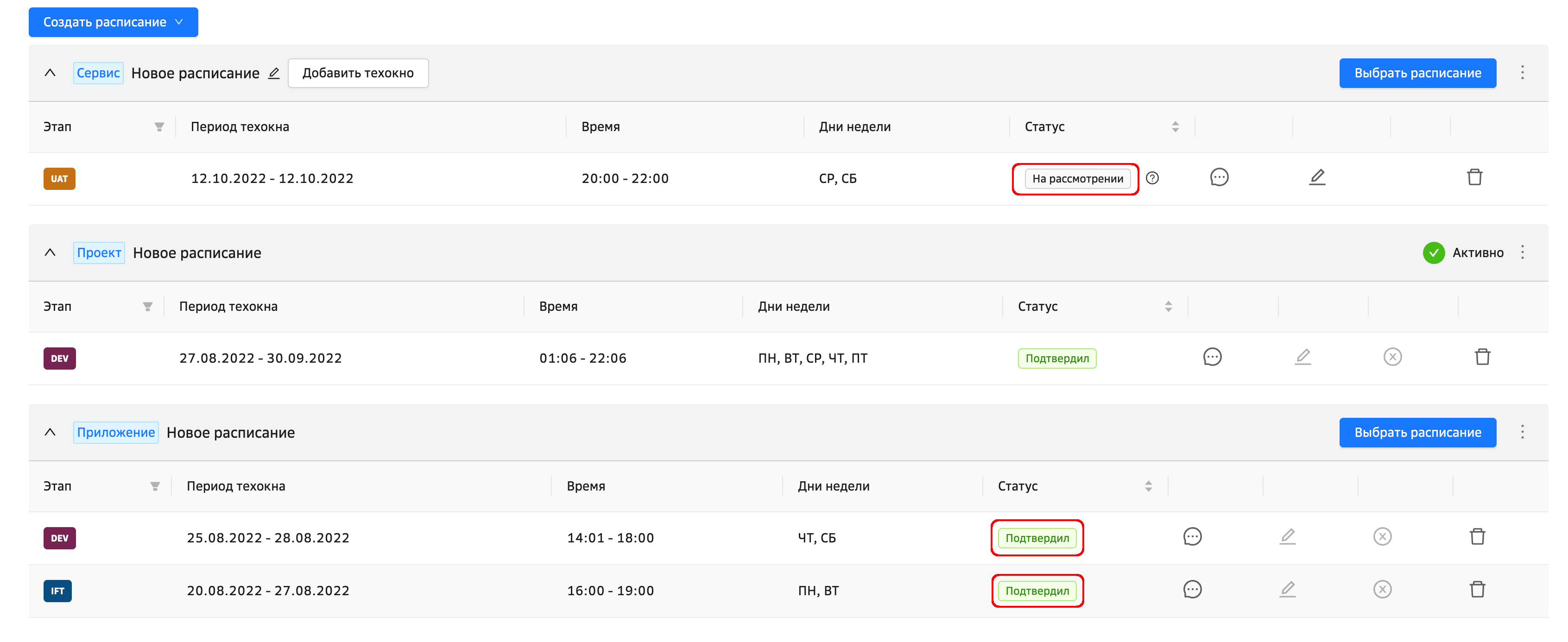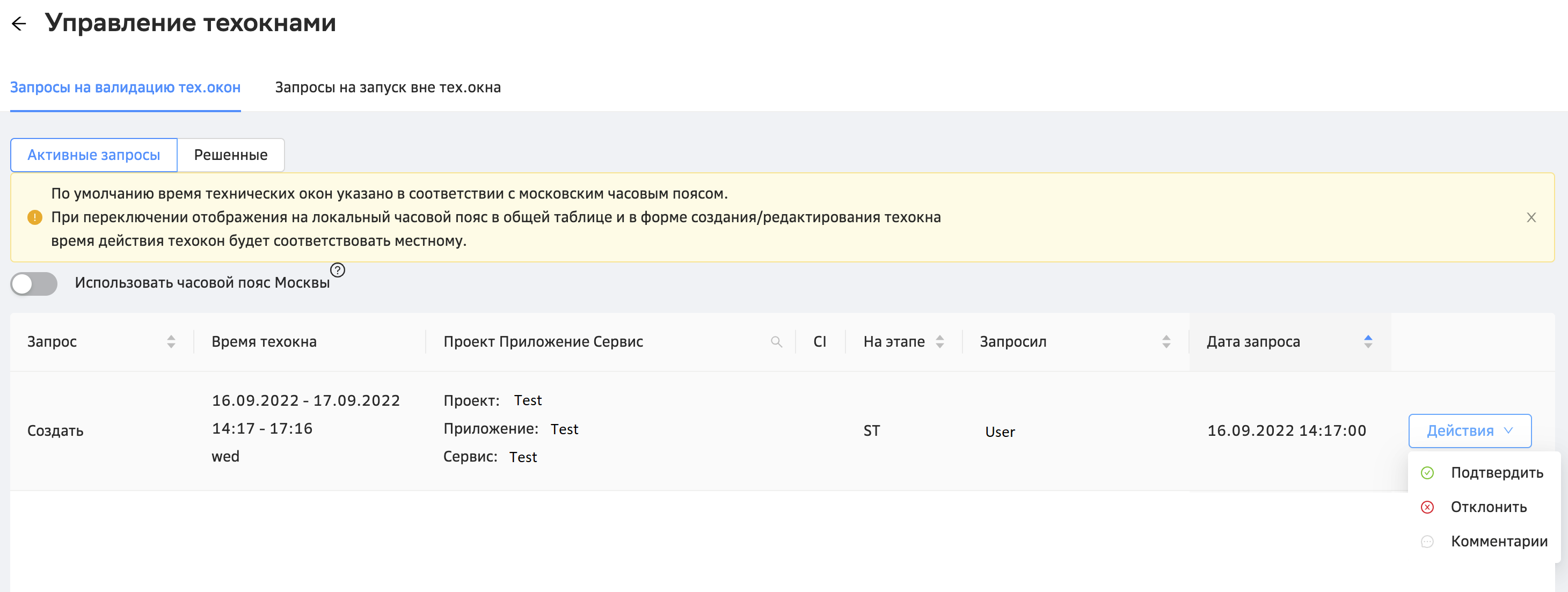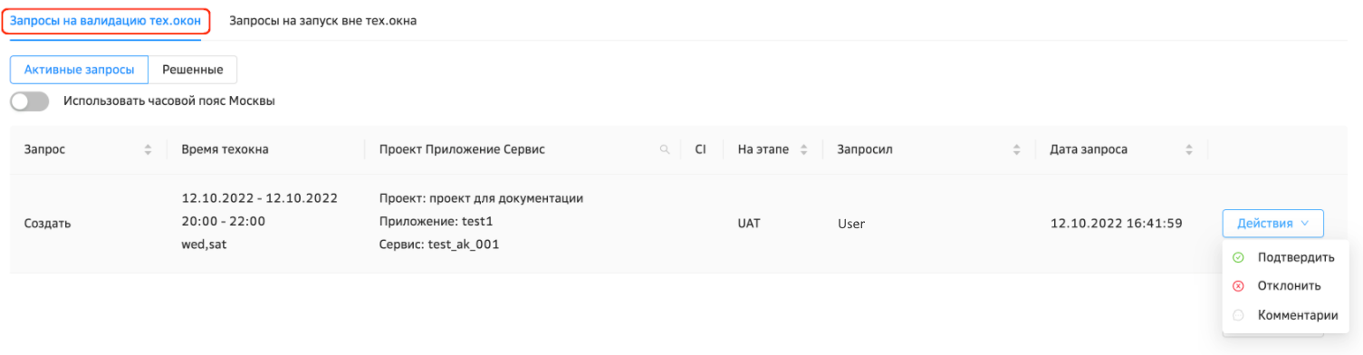 Вкладка позволяет посмотреть запросы на валидацию технологических окон и запросы на запуск вне технологического окна