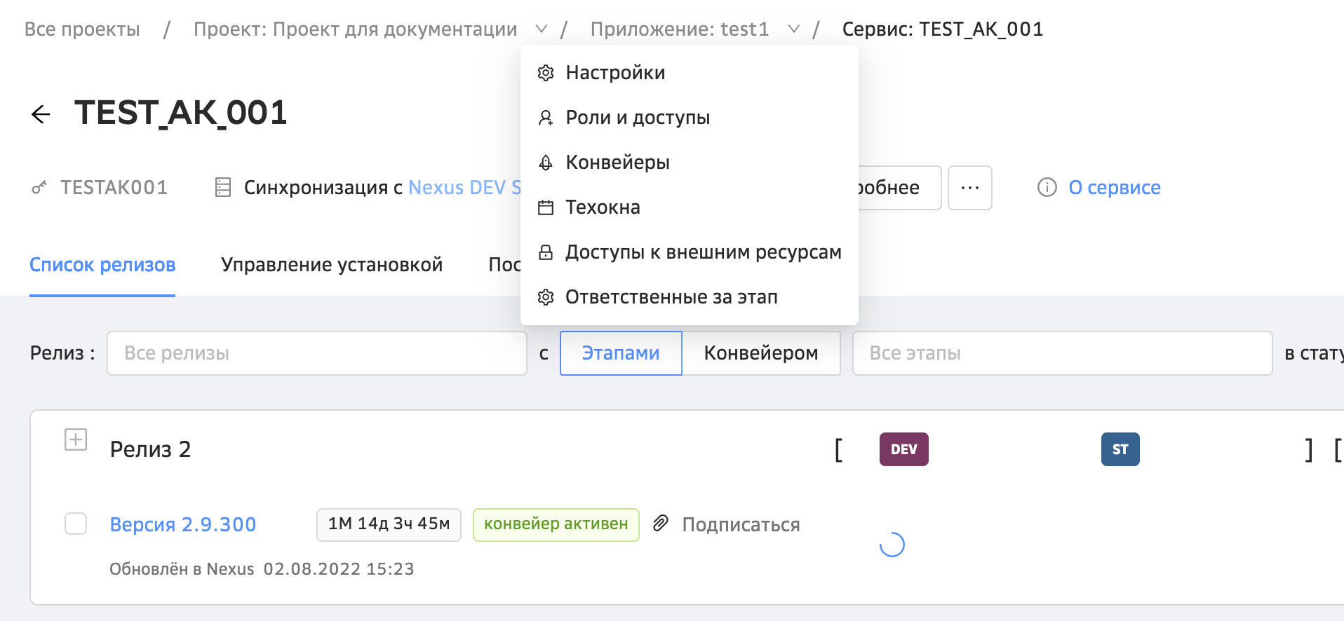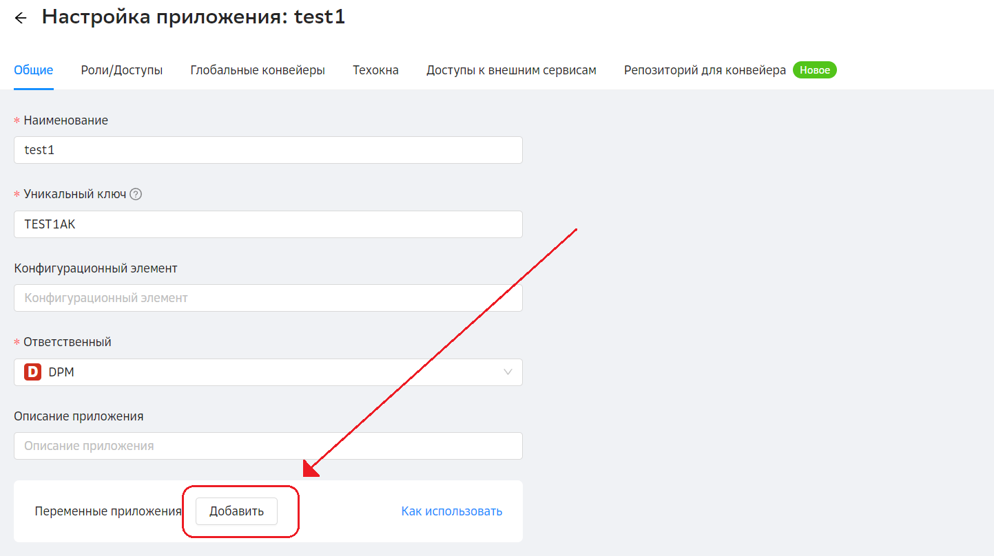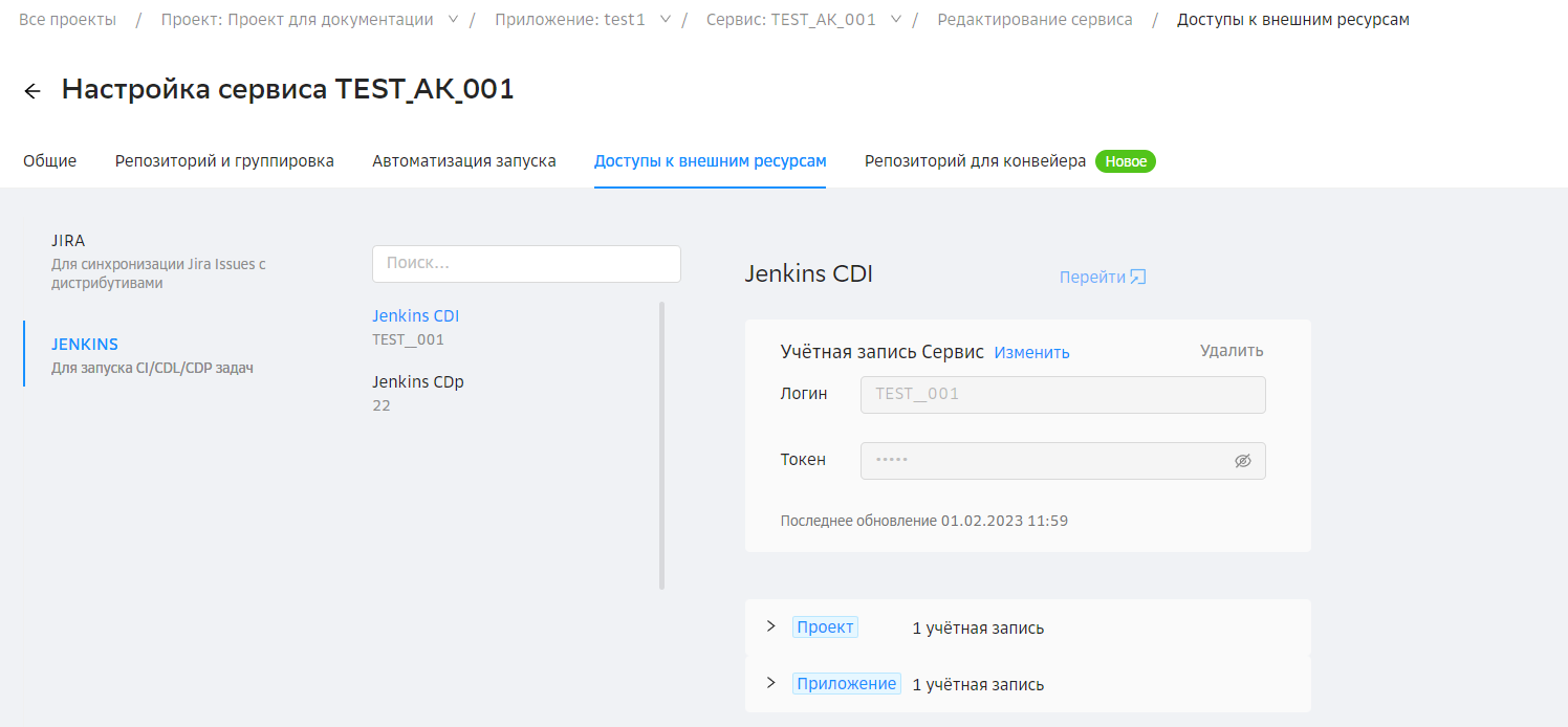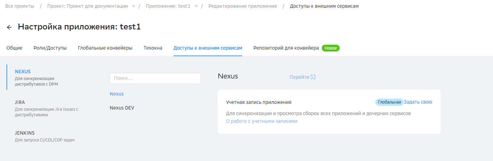На уровне приложения можно настроить роли пользователей, конвейеры и учетные данные для доступа ко внешним сервисам (Jenkins, Nexus и др.), которые будут применяться ко всем сервисам только этого приложения.