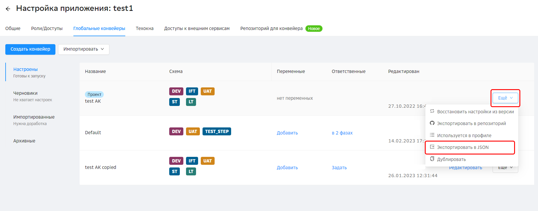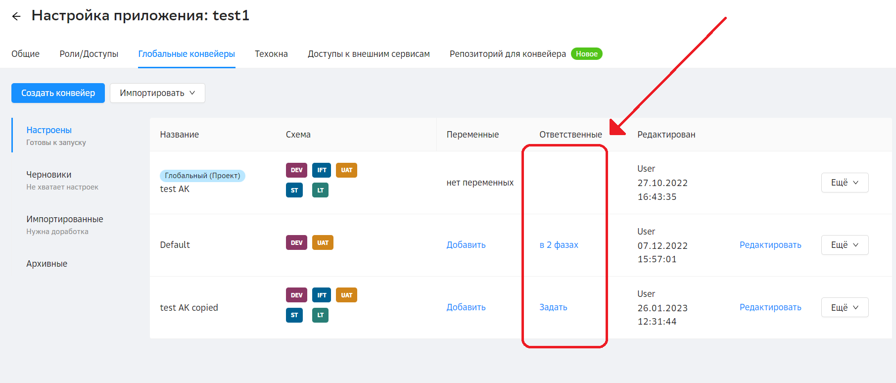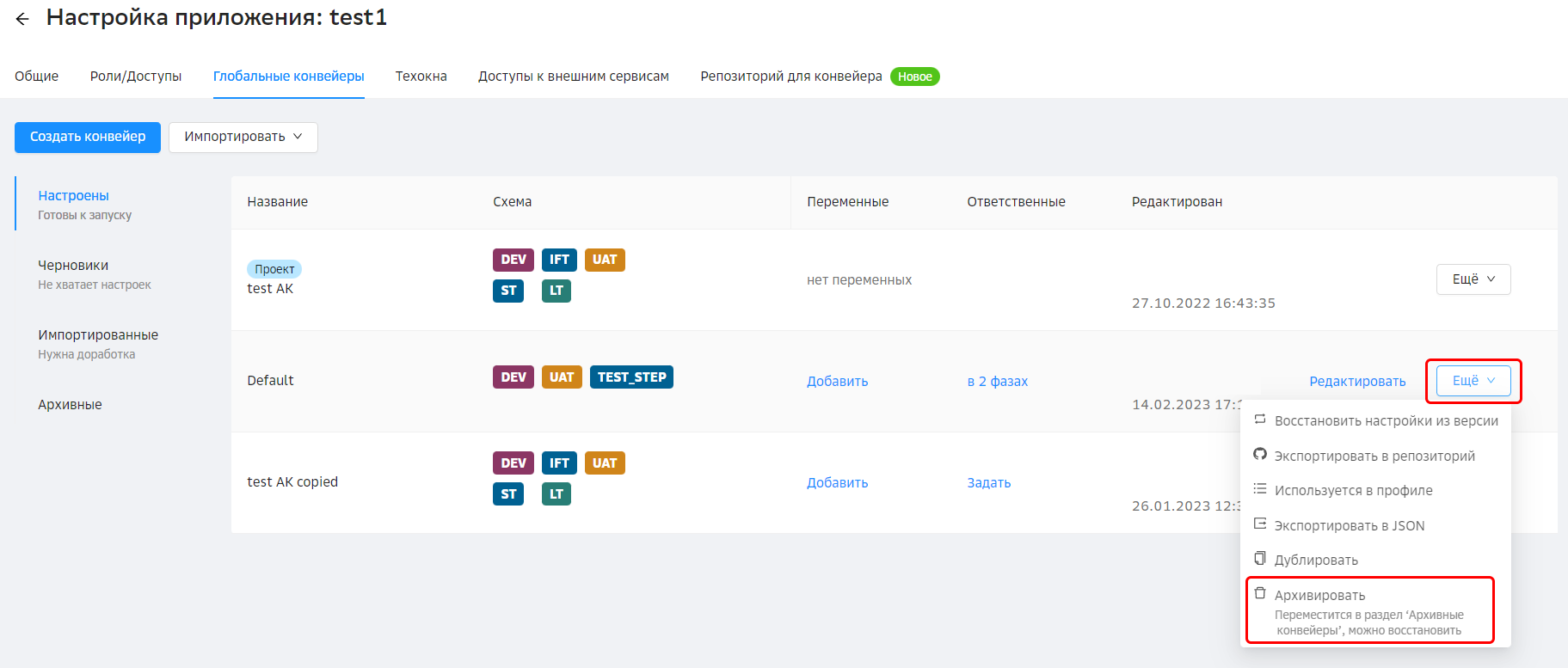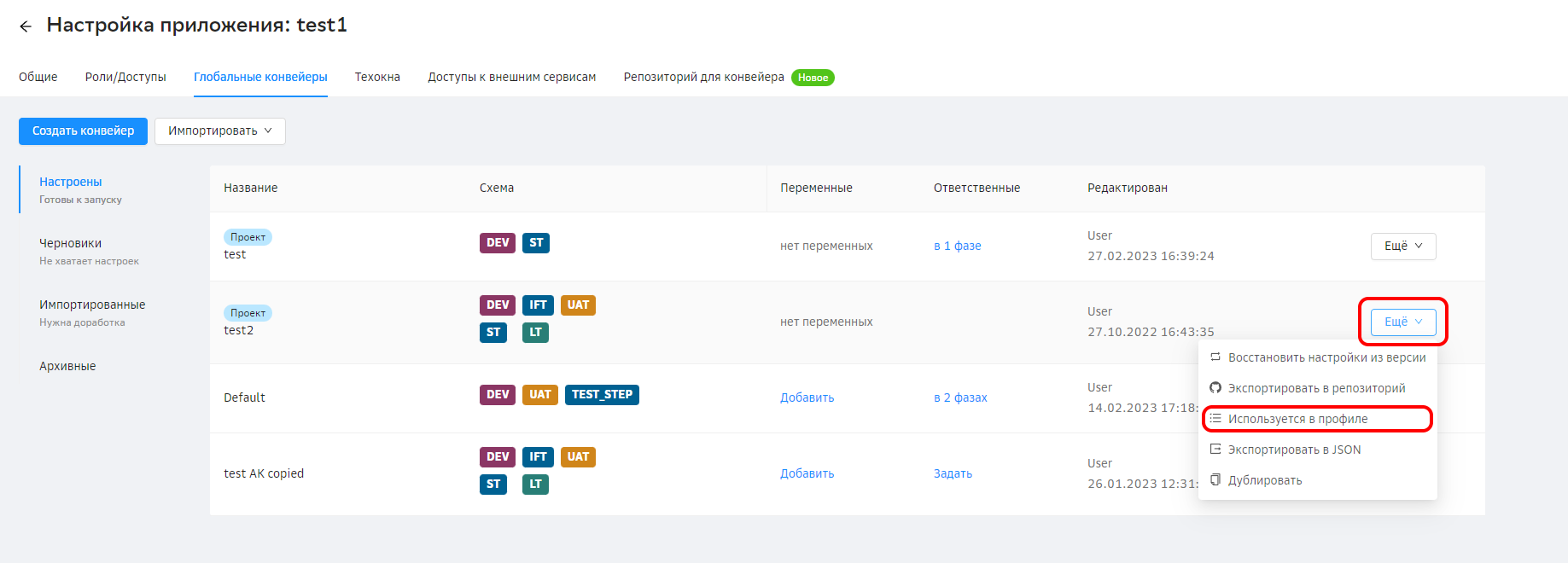 На уровне приложения можно настроить роли пользователей, конвейеры и учетные данные для доступа ко внешним сервисам (Jenkins, Nexus и др.), которые будут применяться ко всем сервисам только этого приложения.