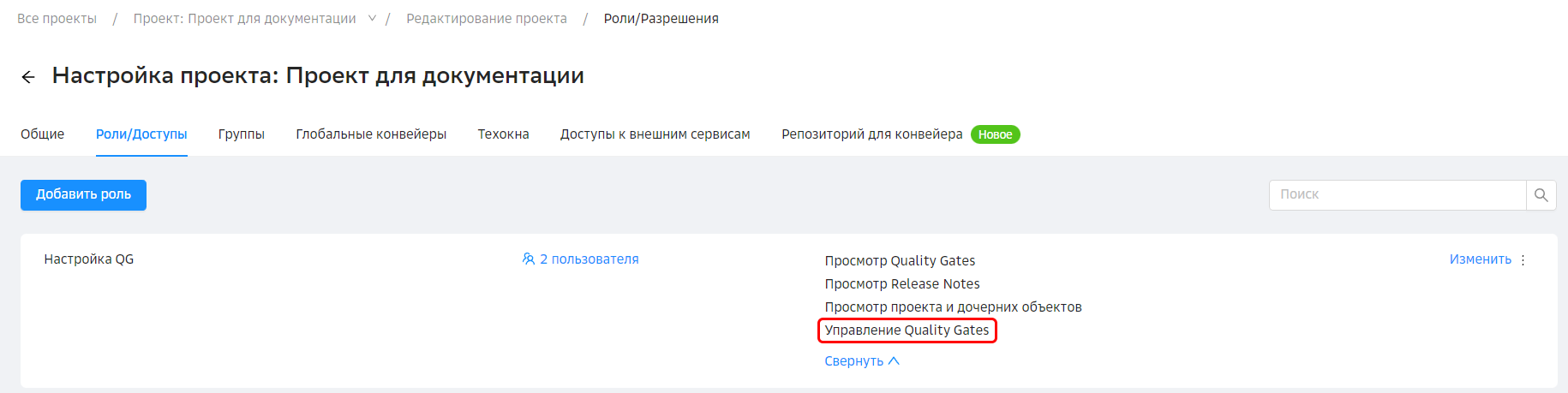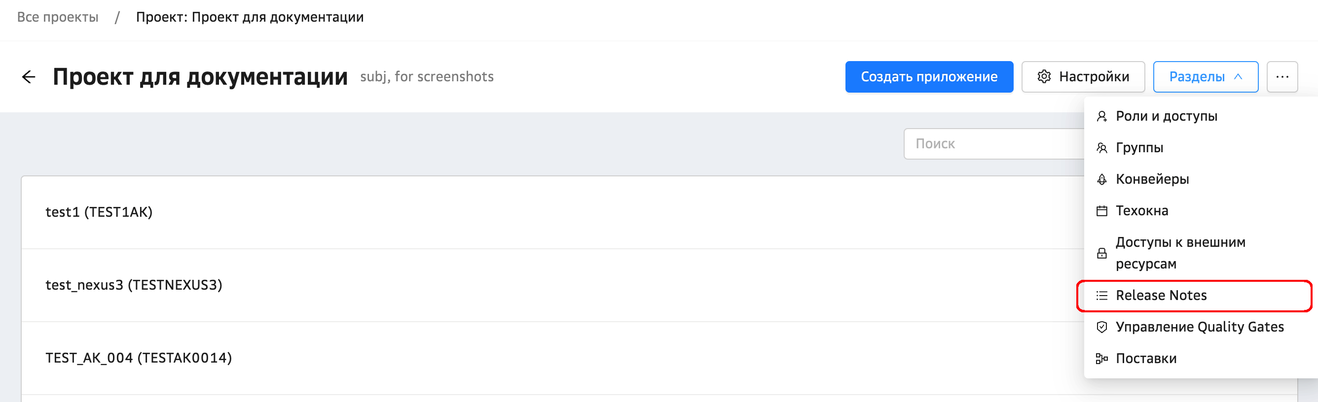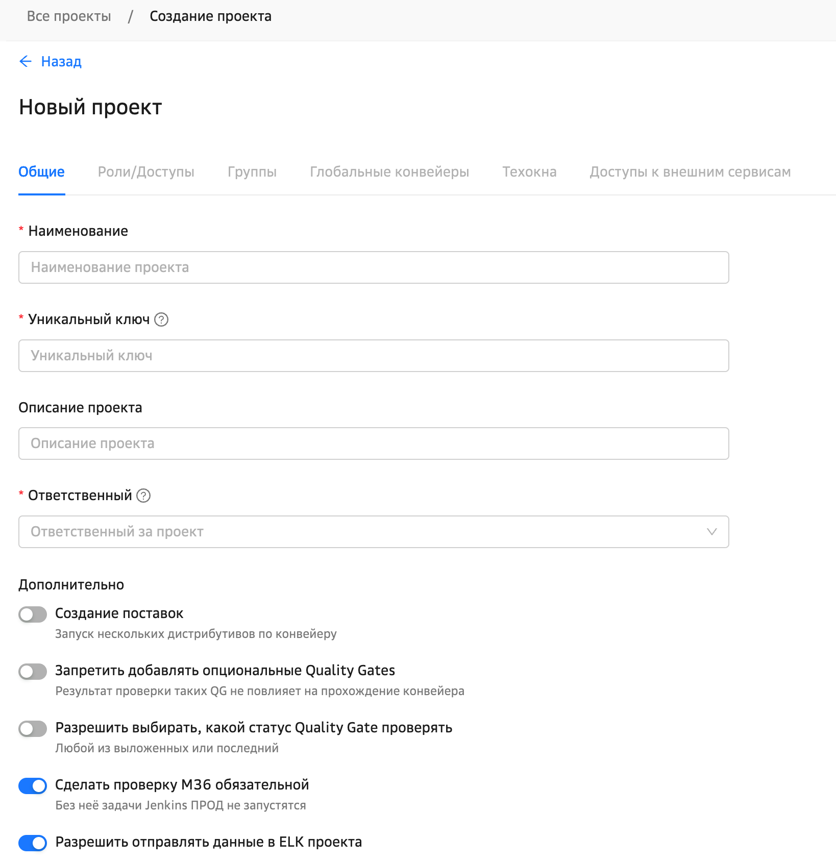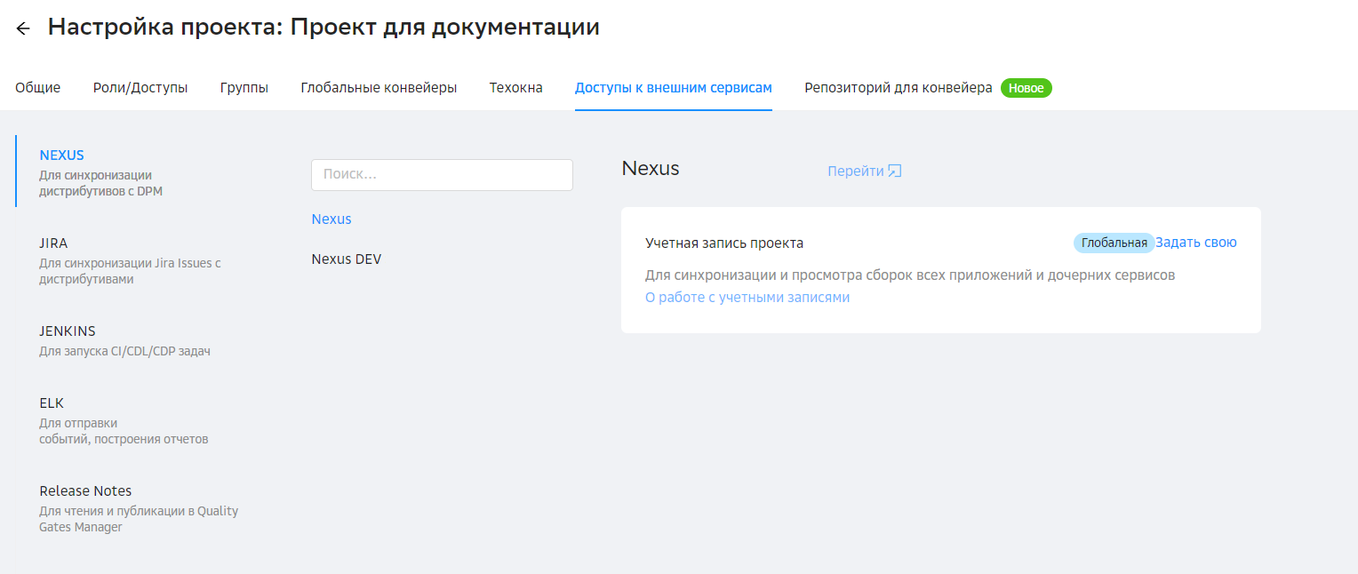 На уровне проекта можно настроить роли и доступы, группы, глобальные конвейеры, техокна, учетные данные для доступа ко внешним сервисам (Jenkins, Nexus и др.), которые будут применяться ко всем приложениям этого проекта.