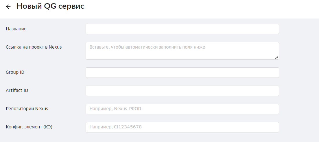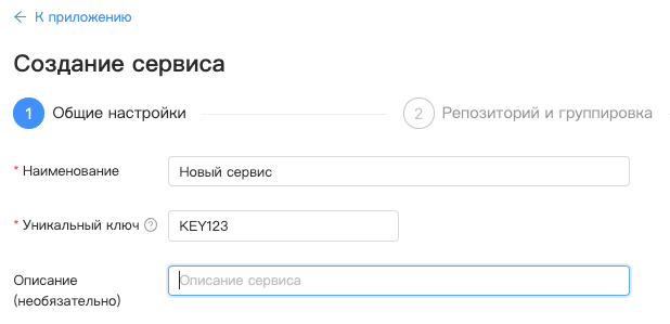 Заполните обязательные параметры: наименование, уникальный ключ, ответственный. Данные параметры могут быть изменены после создания сервиса: