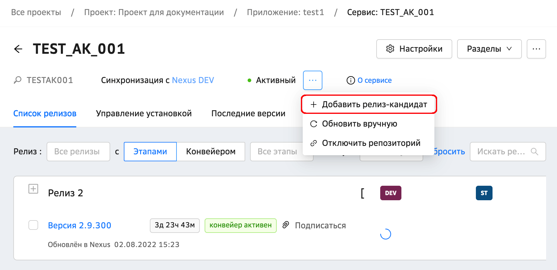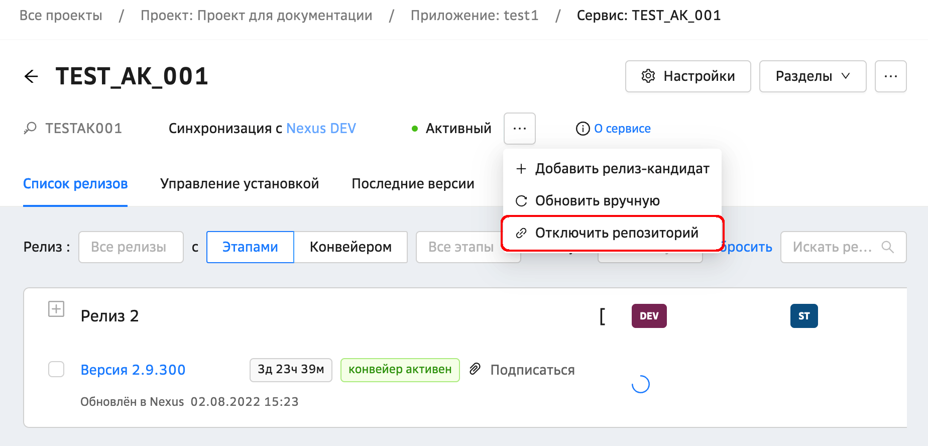 Сервис — набор дистрибутивов, выпускаемых командой разработки. Соответствует Group ID + Artifact ID в Nexus.