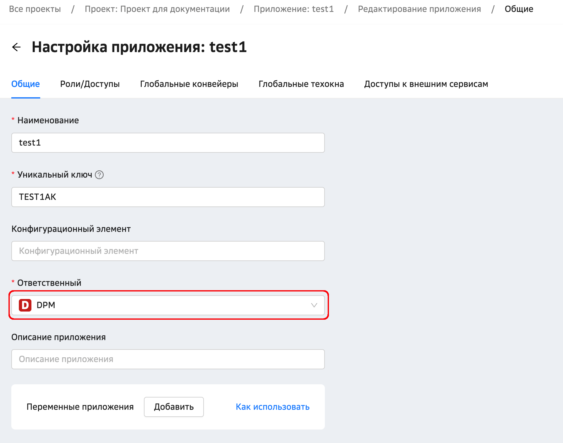 Ответственный (обязательное) — пользователь, ответственный за приложение (потом можно поменять в любой момент).