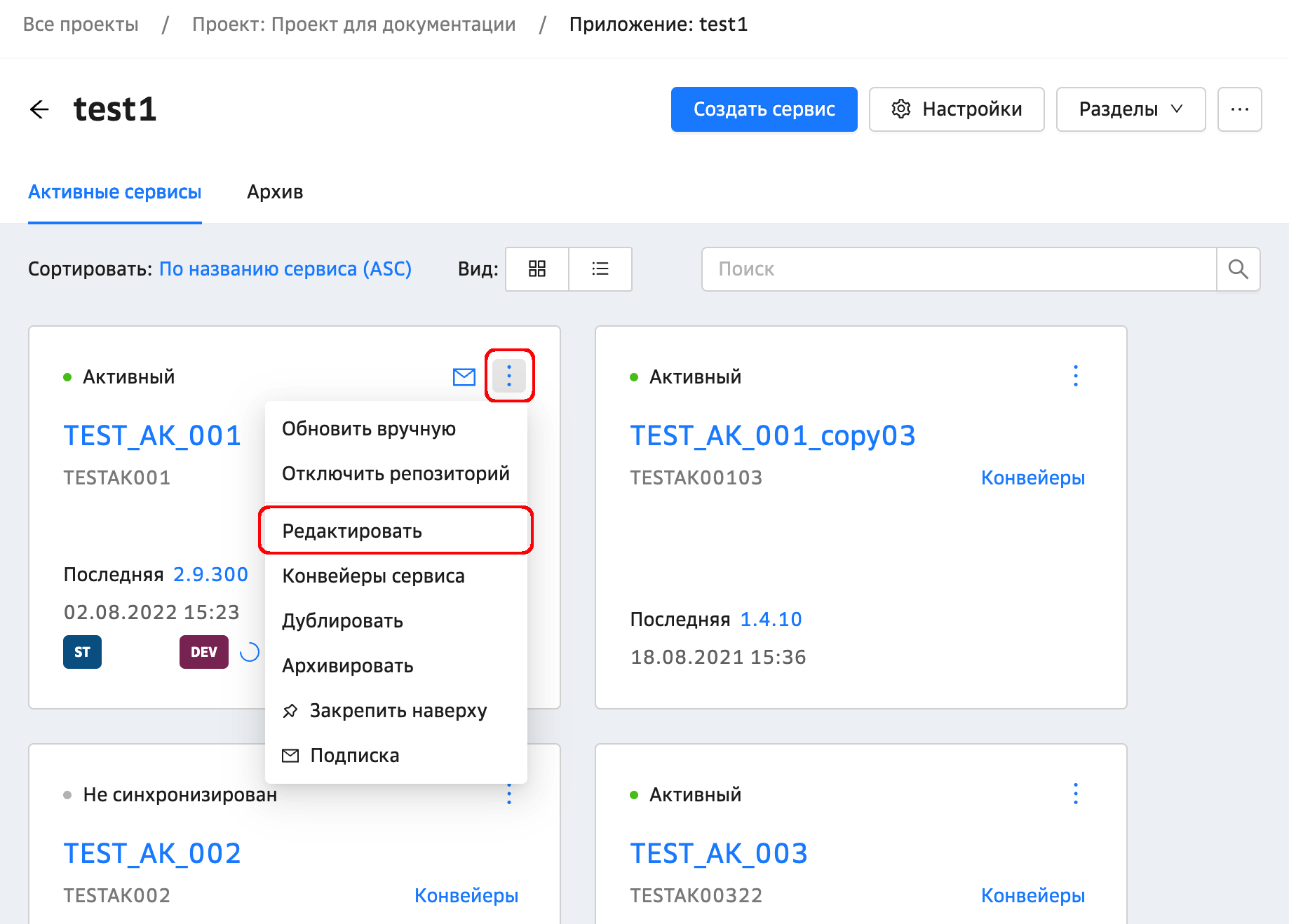 Перейдите на страницу приложения и нажмите кнопку Создать сервис, расположенную в верхней правой области.