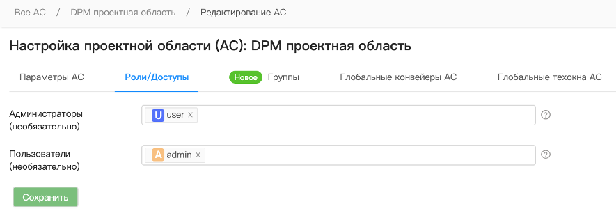 На текущий момент для Пространства преднастроены 2 пользовательские роли: Администратор пространства может просматривать и вносить изменения в пространство, а также проекты входящие в него. Пользователь пространства может только просматривать информацию по пространства без возможности внесения изменений. |
