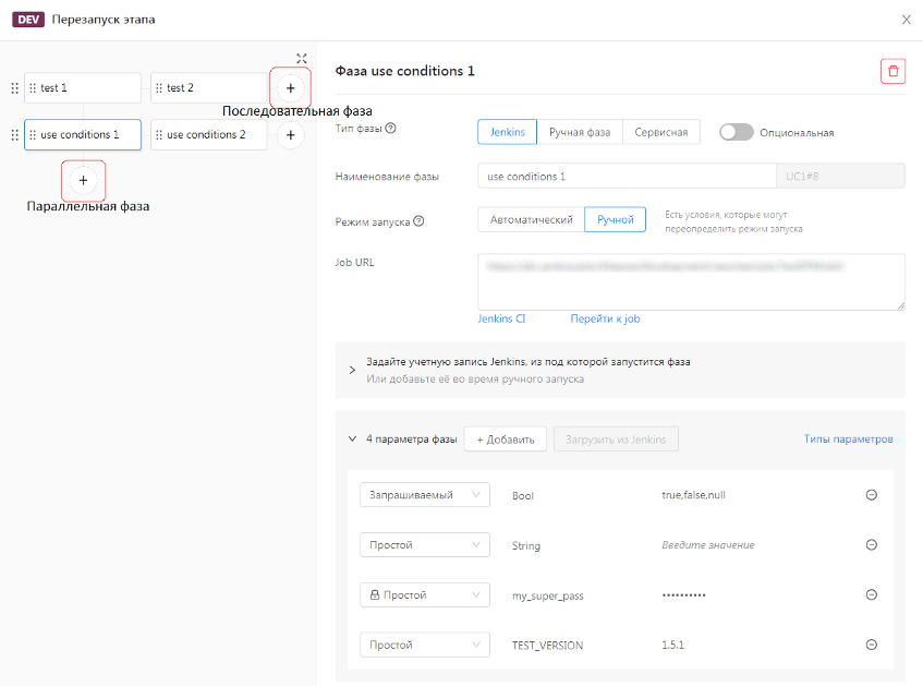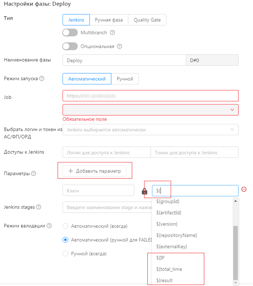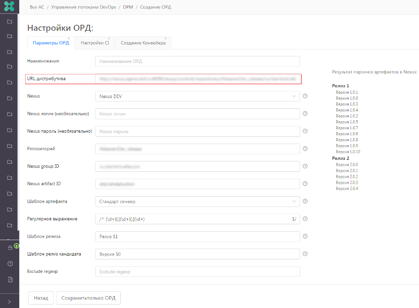 настройка доступов к Nexus (опциональные поля): Nexus, логин, пароль.
