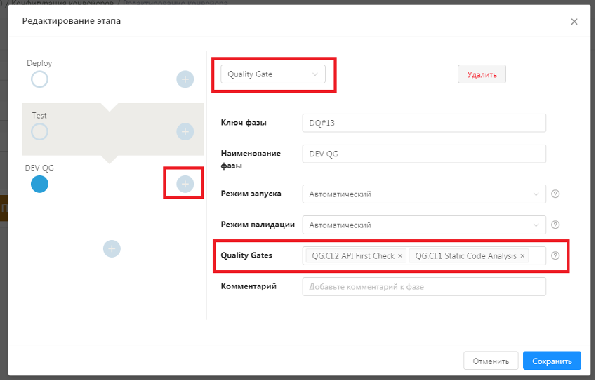 В открывшемся окне заполните следующие поля: **Название Quality Gate — краткое уникальное наименование флага. Публичный — кастомные флаги QG доступны для использования только для тех пространств, для которых они созданы. Если установлен признак публичности, это значит что сторонние проекты (вне данного пространства) смогут т++олько считать его.++ Если признак снят, то у сторонних проектов не будет доступа на считывание флага. Статусы — статусы, которые может принимать флаг. По умолчанию поле заполнено значениями OK и ERR. Вы можете удалить их, указав иные статусы. Пространство — область для которой применяется QG. Поле не доступно для правок. Описание — для удобства последующей работы опишите суть проверок данного QG. После заполнения нажмите кнопку "Сохранить". |