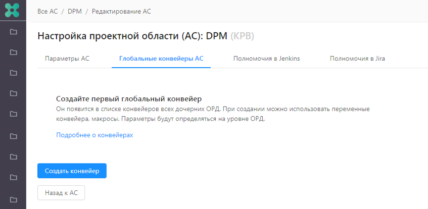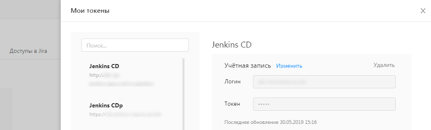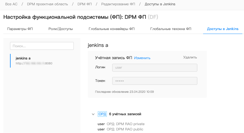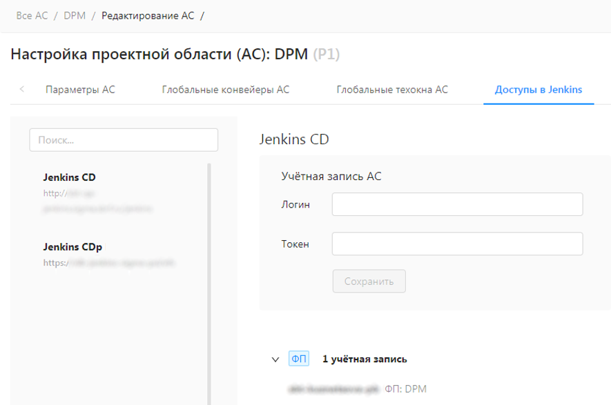 На уровне проектной области и функциональной подсистемы DPM можно добавить учетные записи и токены, которые будут использоваться DPM для входа в Jenkins.
