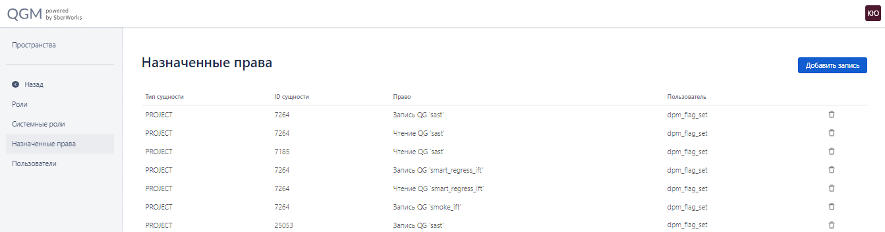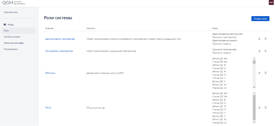 создание/редактирование/удаление ролей (на уровне QGM, пространств или проектов);