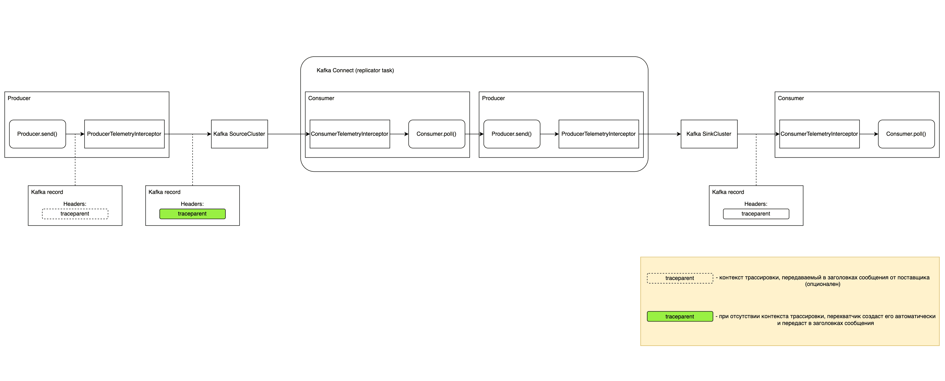 Опционально библиотеку kafka-telemetry-interceptor можно подключить к клиентам поставщиков и потребителей событий.