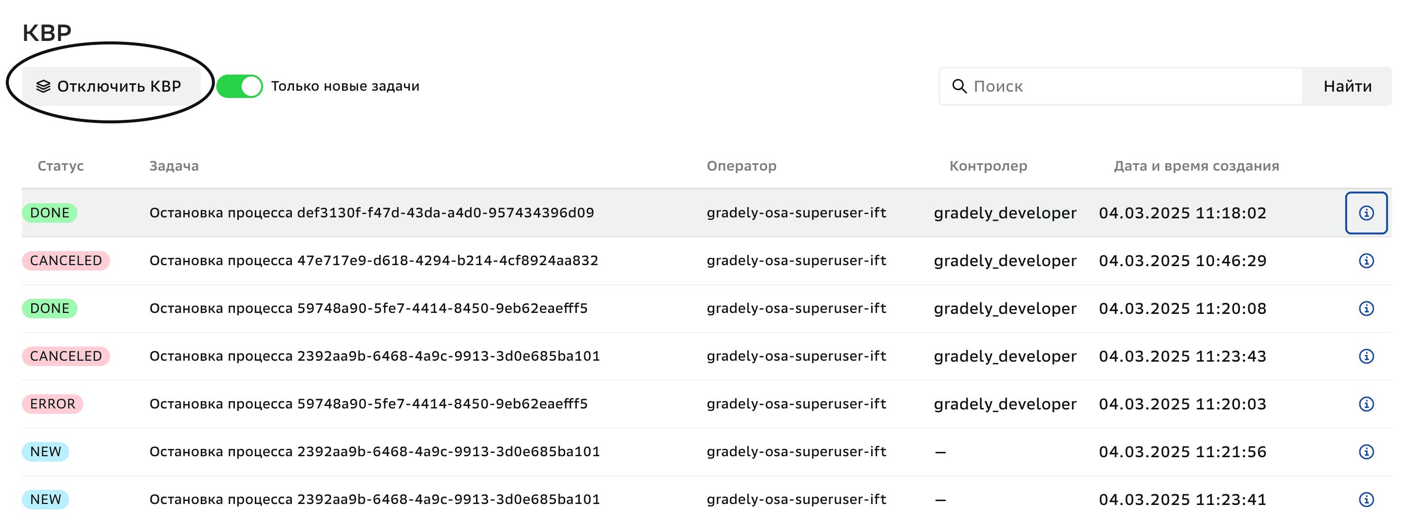 Контроль второй рукой распространяется на остановку процесса и на отключение КВР на 15 минут. Отключать КВР может только администратор с ролью MAINTENANCE_INSPECTOR.