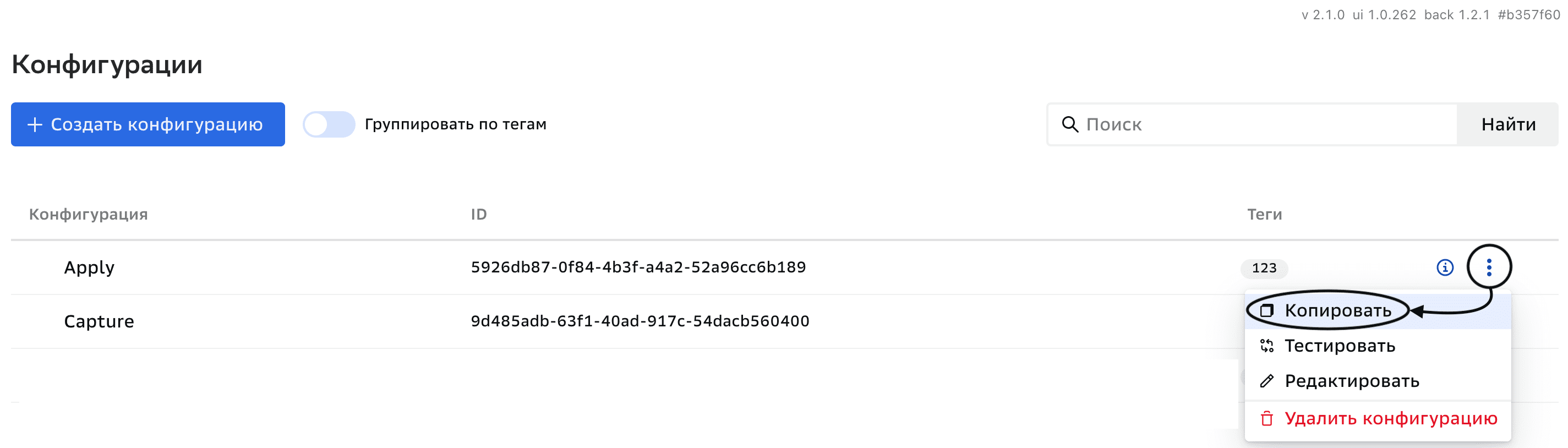кнопки для редактирования, удаления, создания, копирования конфигурации (отображаются у APPADMIN);