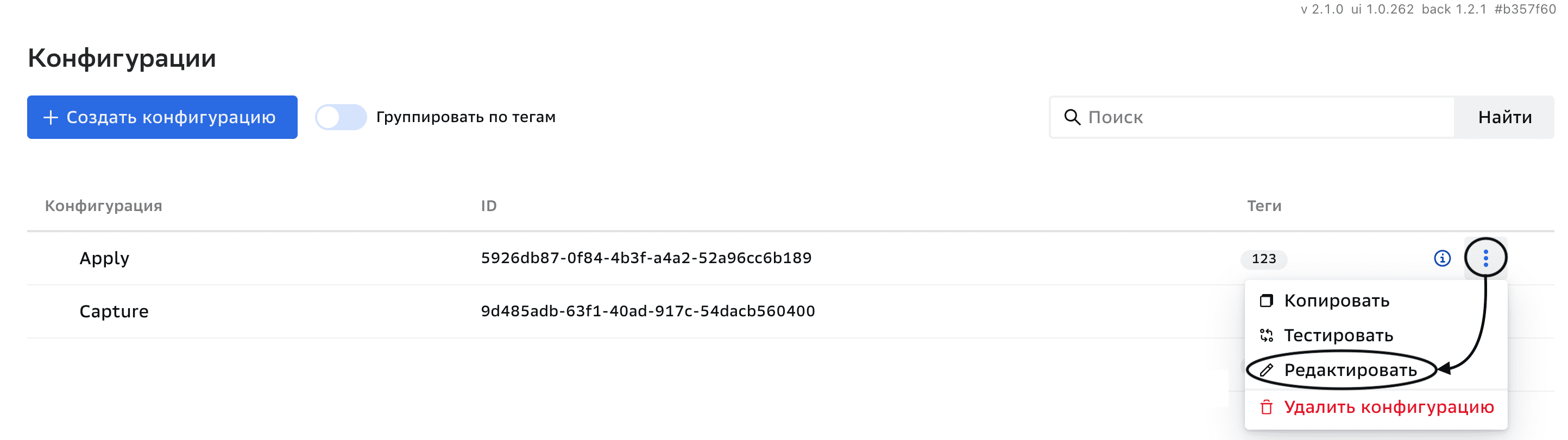 рядом с названием конфигурации и выберите Редактировать в открывшемся меню.Заполните поля в открывшемся окне: