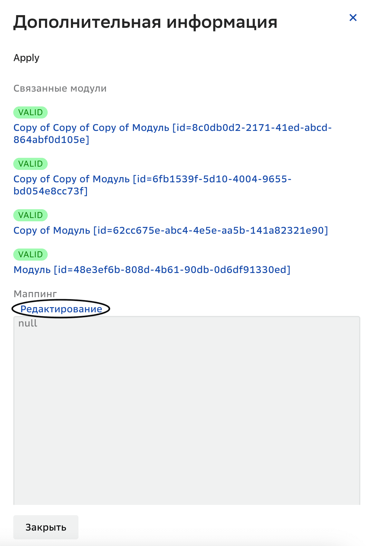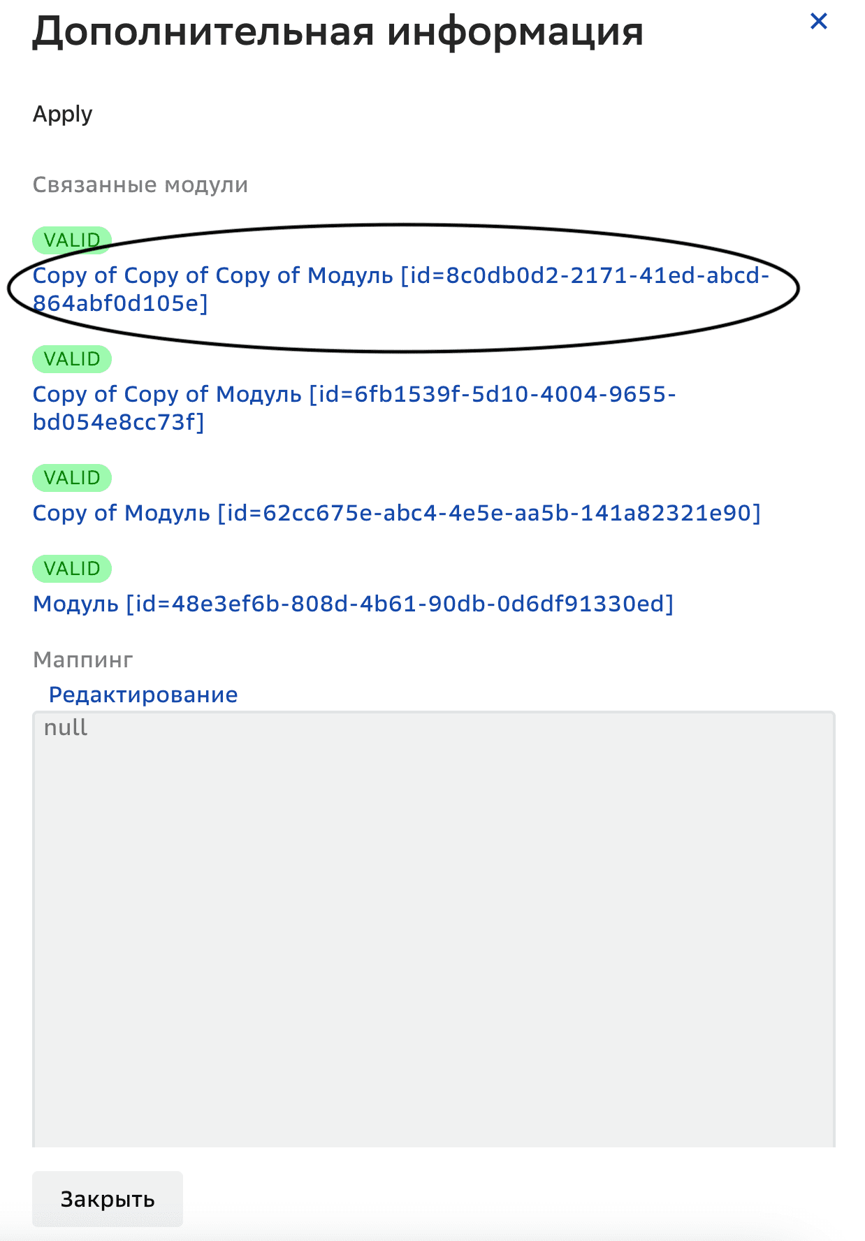 рядом с названием соединения.Нажмите на идентификатор модуля из перечня связанных модулей, в открывшемся окне Дополнительная информация, чтобы посмотреть информацию о модуле, привязанном к конфигурации.