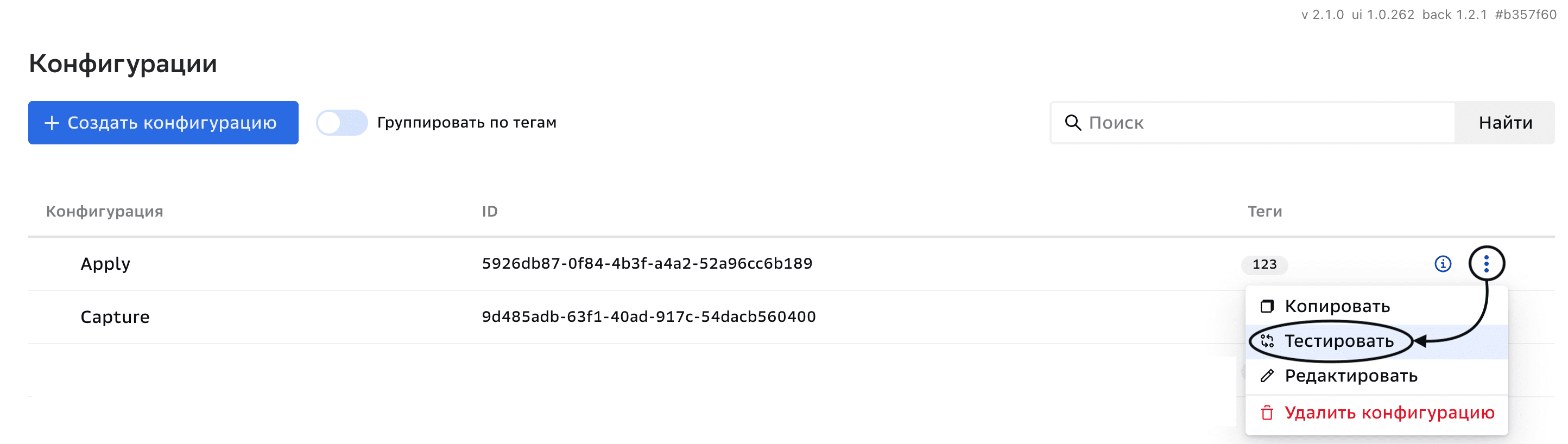 рядом с названием конфигурации и выберите Тестировать в открывшемся меню.Кнопка валидации активна только, когда граф не запущен.