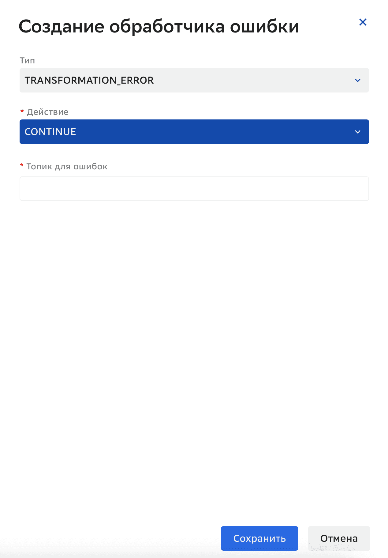 Укажите топик для записи сообщения об ошибке, если выбрали CONTINUE для cоединений модуль Capture → Очередь (связь 2) и Очередь → модуль Applier (связь 3).