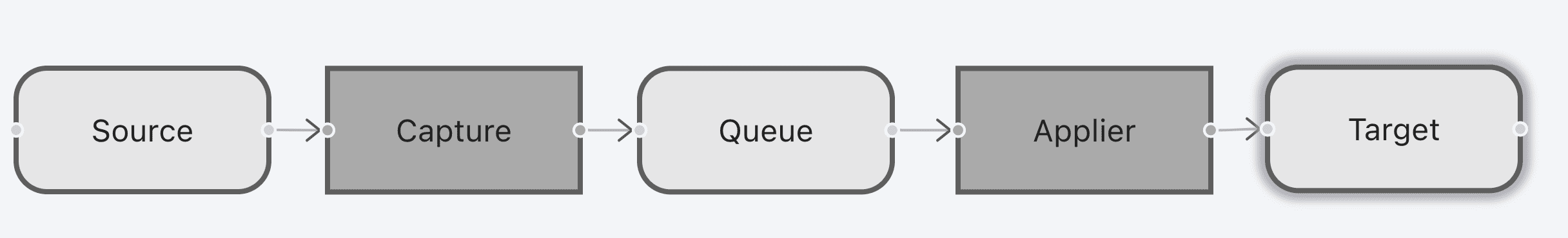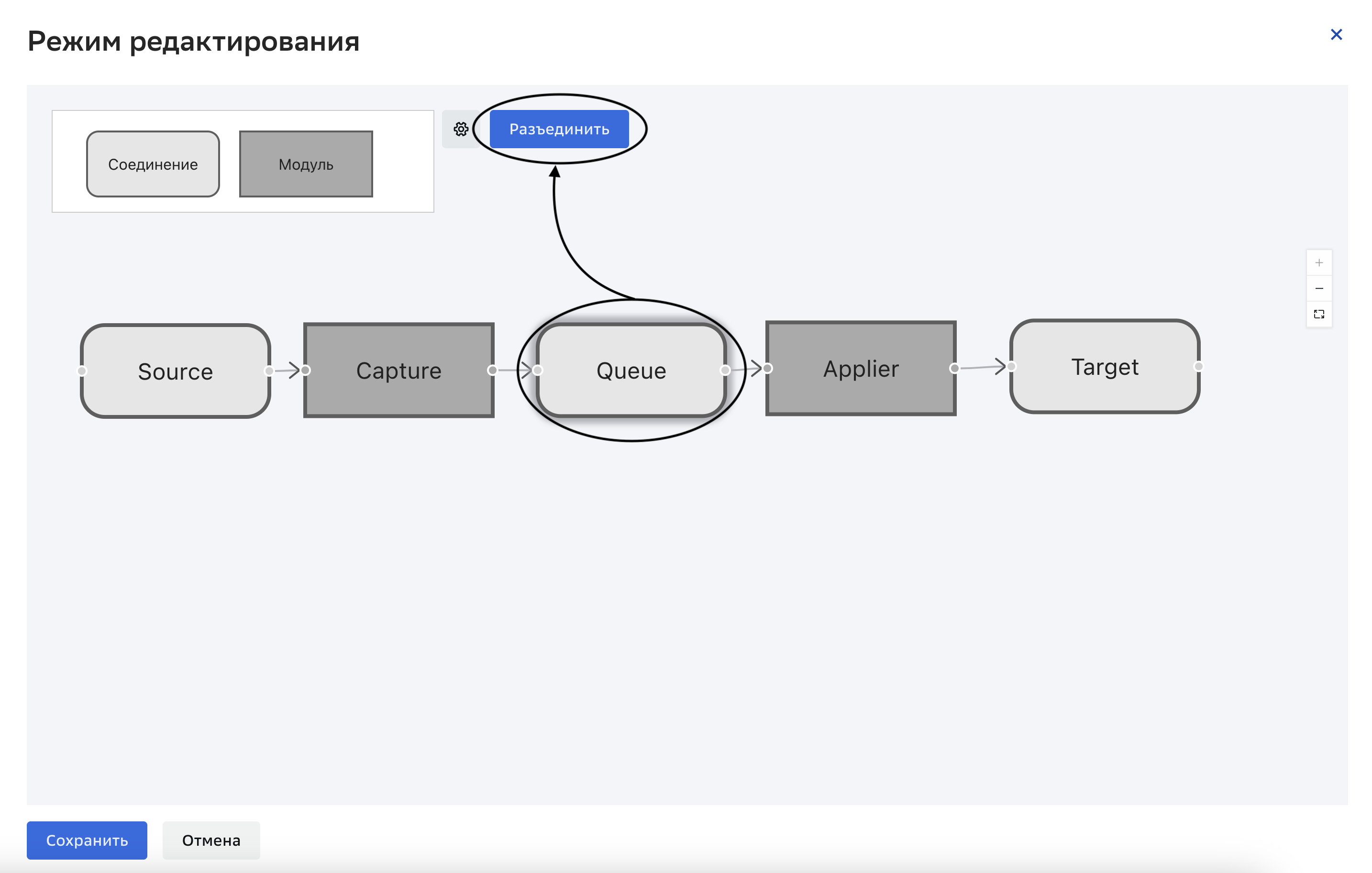 Граф обязательно должен содержать минимум один источник (элемент «Соединение»), один модуль захвата изменений (элемент «Модуль»), одну очередь — Kafka (элемент «Соединение»), один модуль применения изменений (элемент «Модуль»), один приемник (элемент «Соединение»).