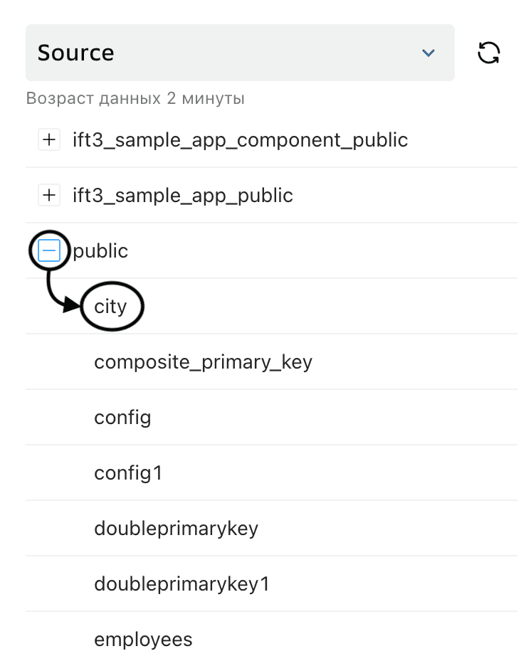 рядом с полем выбора соединения, чтобы обновить перечень схем и таблиц.Нажмите значок