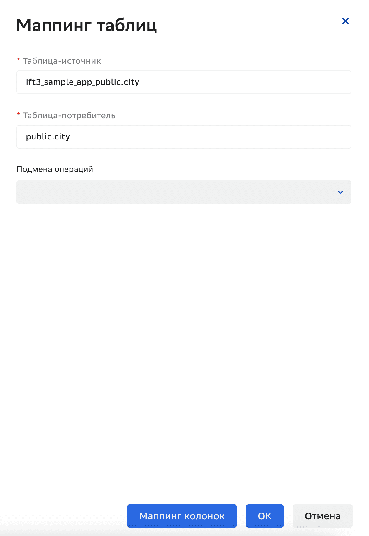 Или нажмите Добавить под Маппинг колонок и укажите колонку на источнике и колонку на потребителе в открывшемся окне Маппинг колонок.