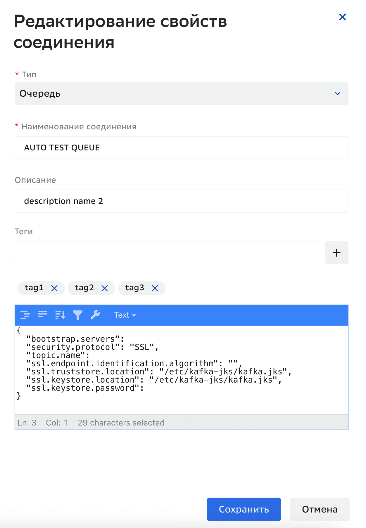 { "bootstrap.servers": "***", (тип: строка, длина: 255 символов) "security.protocol": "SSL", (тип: строка, длина: 255 символов) "topic.name": "***", (тип: строка, длина: 255 символов) "ssl.endpoint.identification.algorithm": "", (тип: строка, длина: 255 символов) "ssl.truststore.location": "/etc/kafka-jks/kafka.jks", (тип: строка, длина: 255 символов) "ssl.keystore.location": "/etc/kafka-jks/kafka.jks", (тип: строка, длина: 255 символов) "ssl.keystore.password": "***" (тип: строка, длина: 255 символов) }Для соединения приемника: