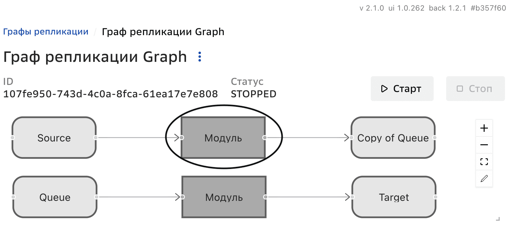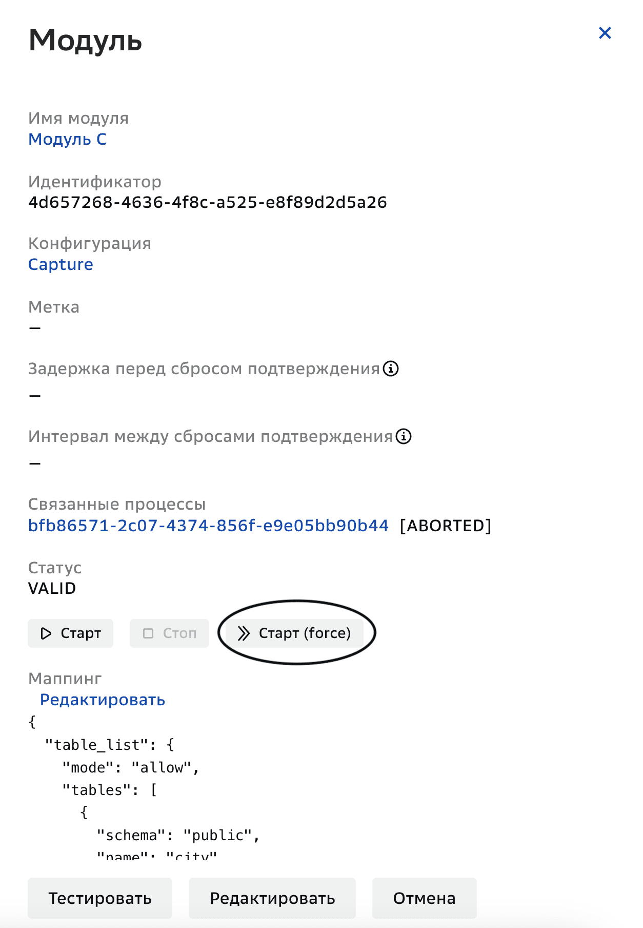 При остановке репликации из-за отказа БД источника для принудительного перезапуска модуля: