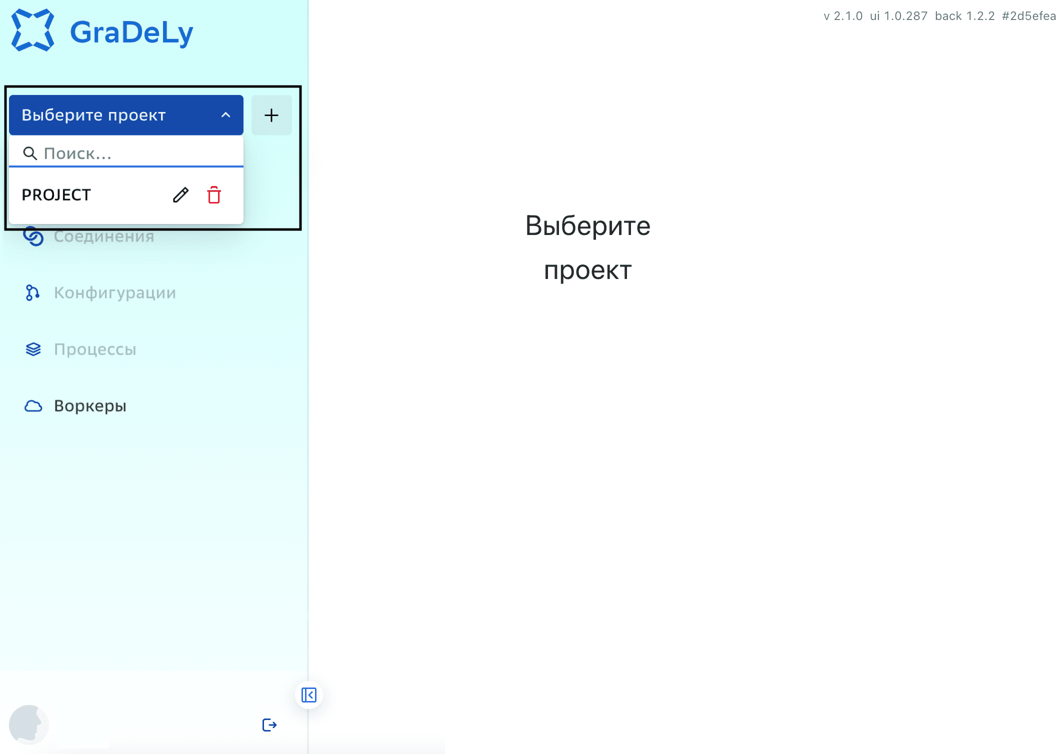 Для начала работы с GraDeLy выберите один из доступных вам проектов из раскрывающегося перечня проектов в левом верхнем углу интерфейса.