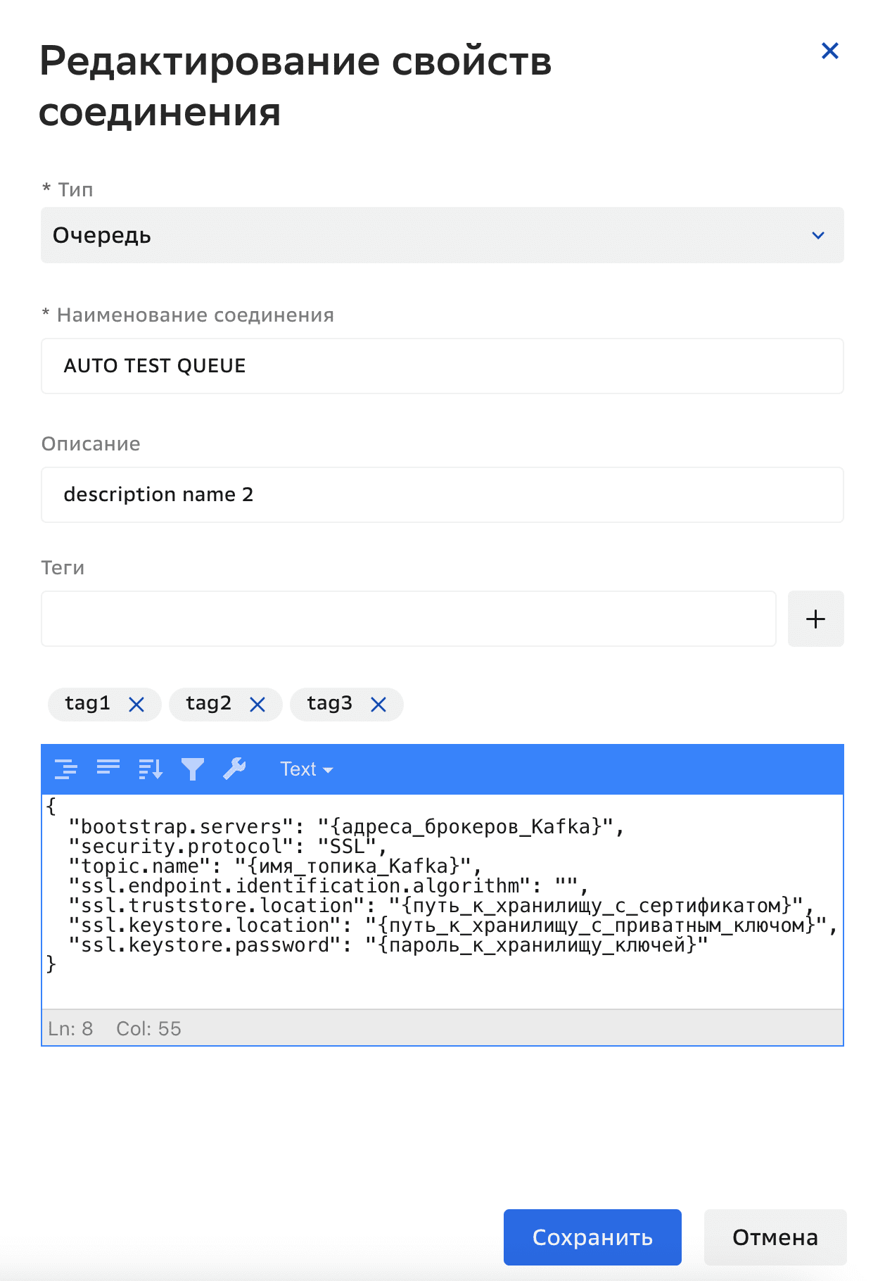 { "bootstrap.servers": "***", "security.protocol": "SSL", "topic.name": "***", "ssl.endpoint.identification.algorithm": "", "ssl.truststore.location": "/etc/kafka-jks/kafka.jks", "ssl.keystore.location": "/etc/kafka-jks/kafka.jks", "ssl.keystore.password": "***" }Параметры соединения с Kafka