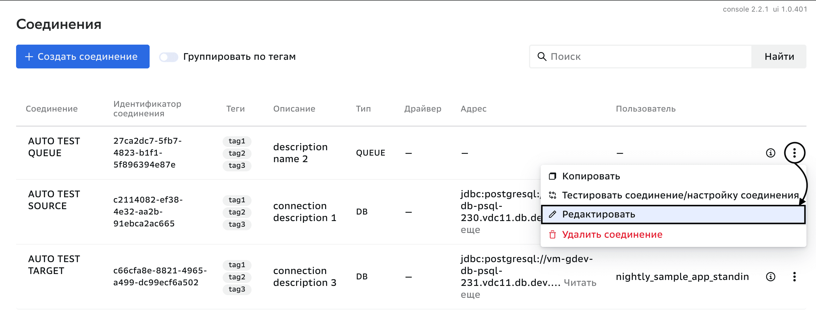 рядом с названием соединения и выберите Редактировать в открывшемся меню.Заполните поля в открывшемся окне Редактирование свойств соединения: