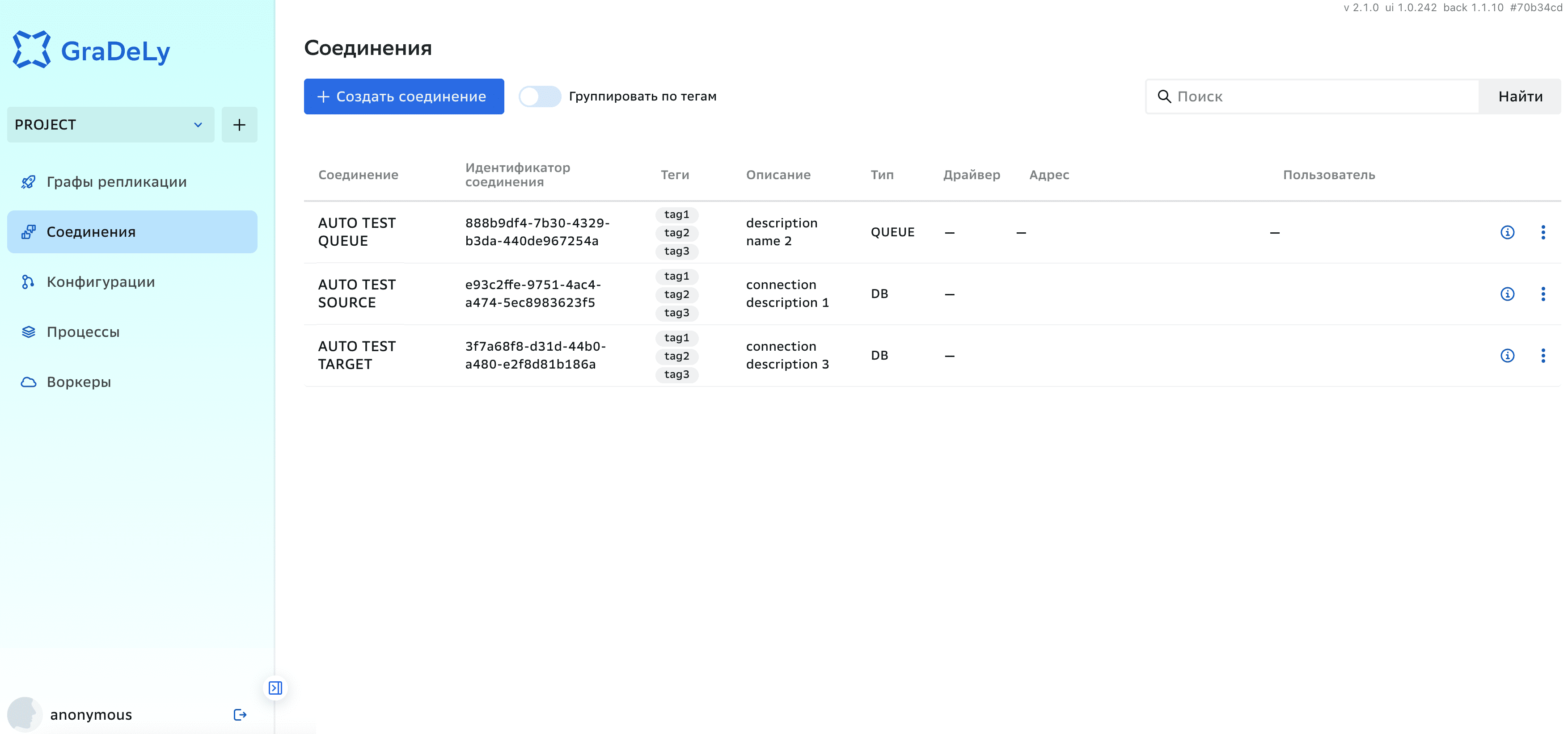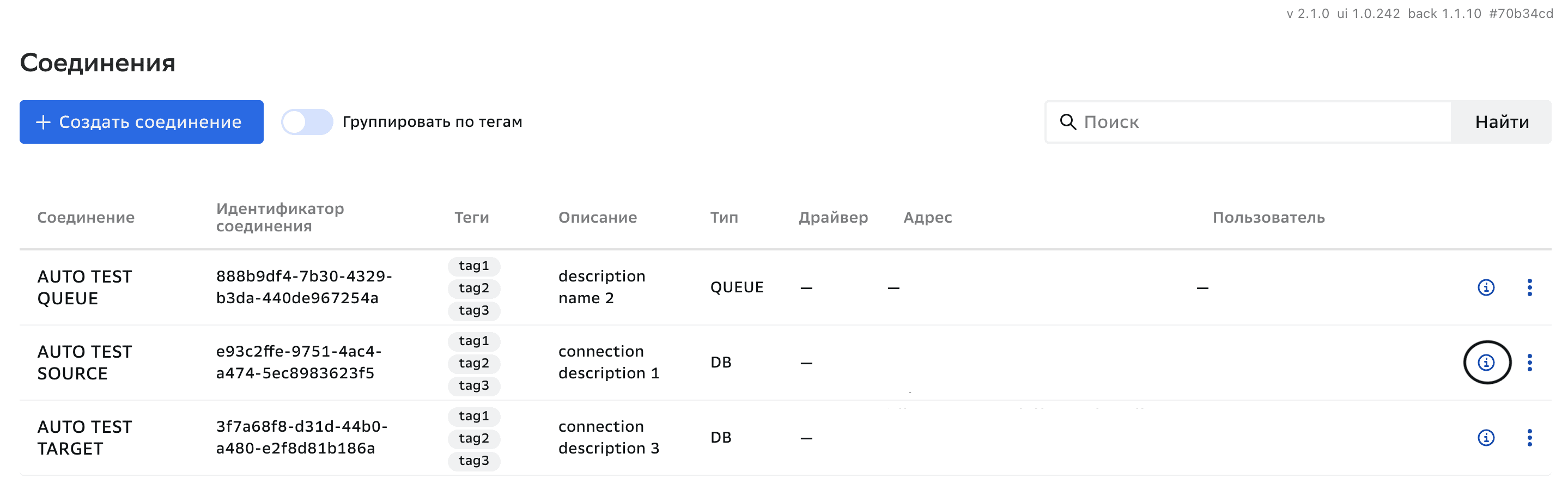 кнопки для редактирования, удаления, создания, копирования соединения (отображаются у APPADMIN);