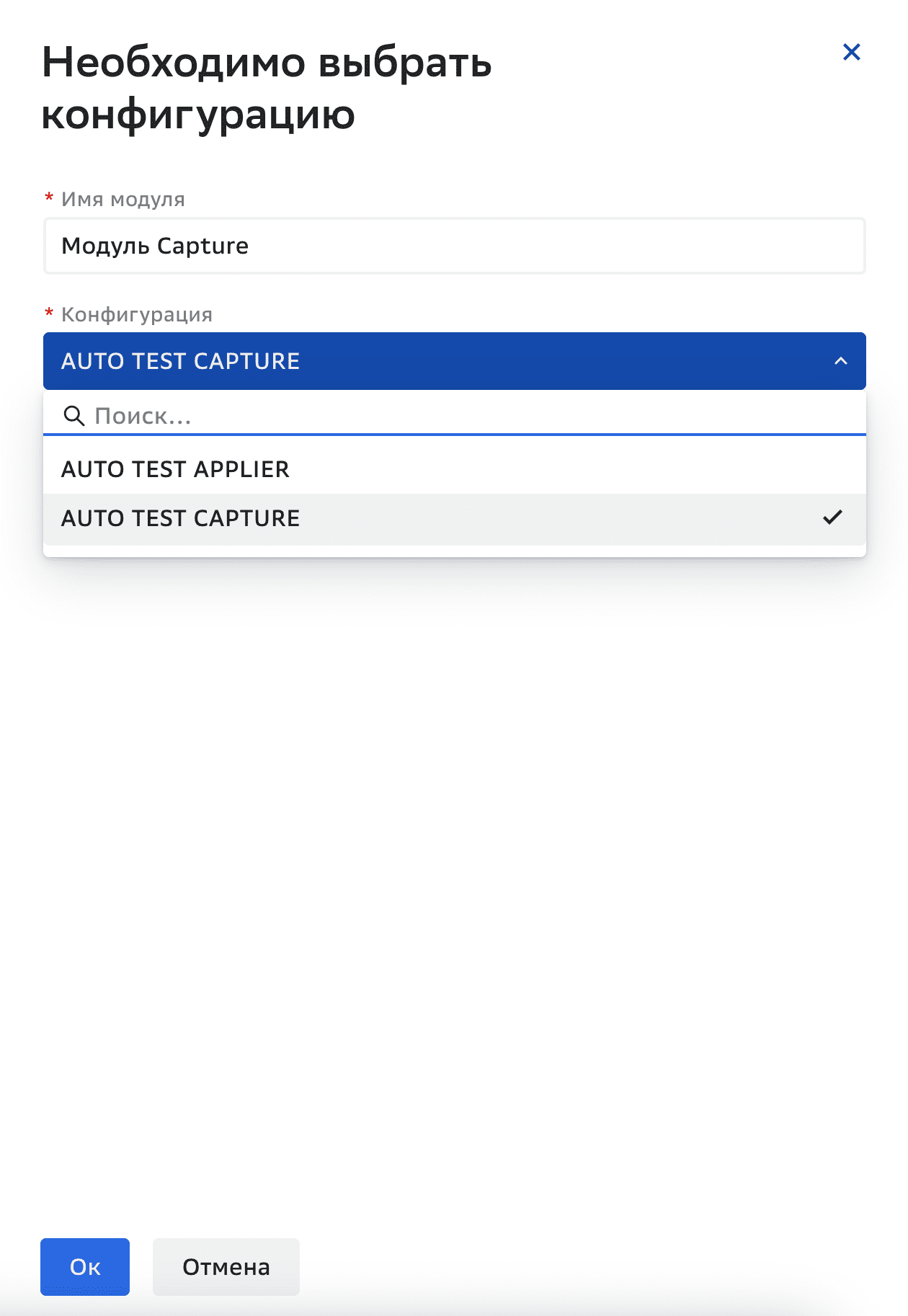 Для элемента Модуль задайте имя модуля и выберите конфигурацию из раскрывающегося списка конфигураций в окне Необходимо выбрать конфигурацию, которое откроется автоматически при перетаскивании элемента в поле редактирования.