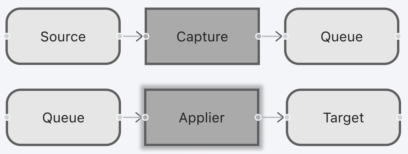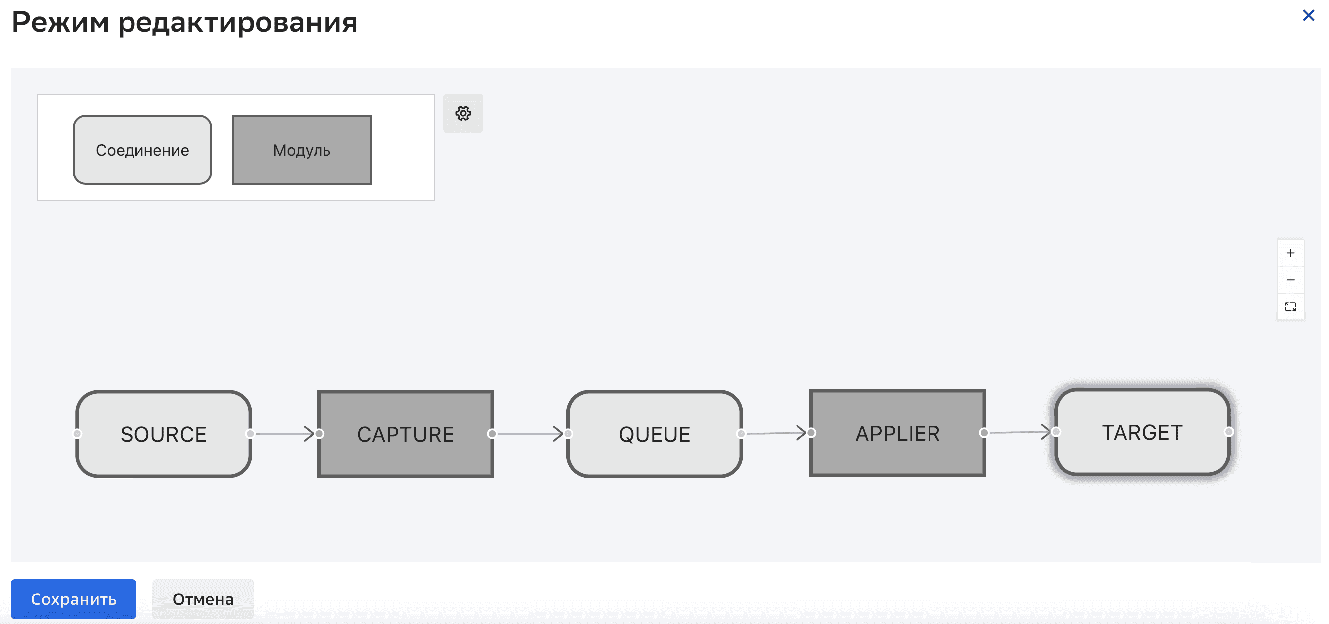 Граф обязательно должен содержать минимум один источник (элемент «Соединение»), один модуль захвата изменений (элемент «Модуль»), одну очередь — Kafka (элемент «Соединение»), один модуль применения изменений (элемент «Модуль»), один приемник (элемент «Соединение»).