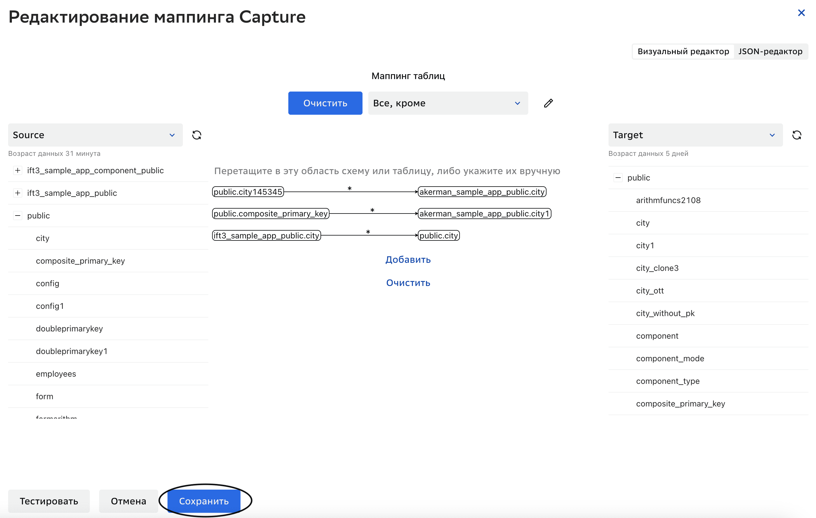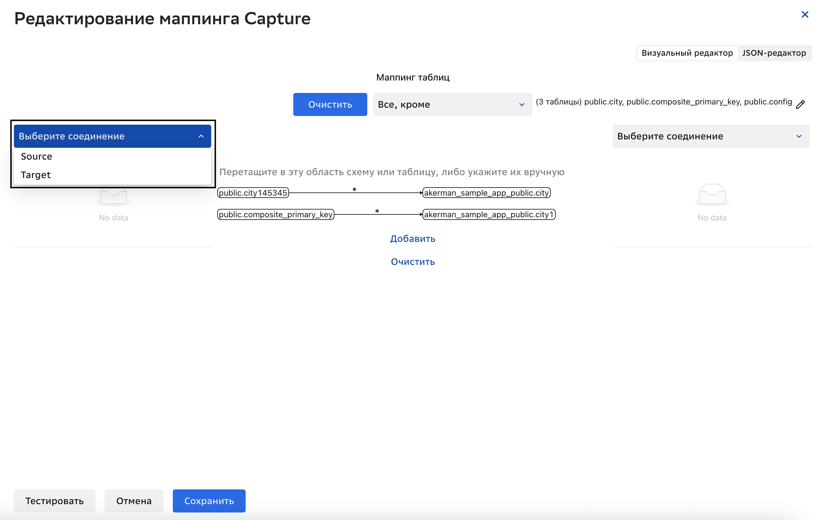 Значения соединения источника и приемника, выбранные в окне Редактирование маппинга, подставятся автоматически.