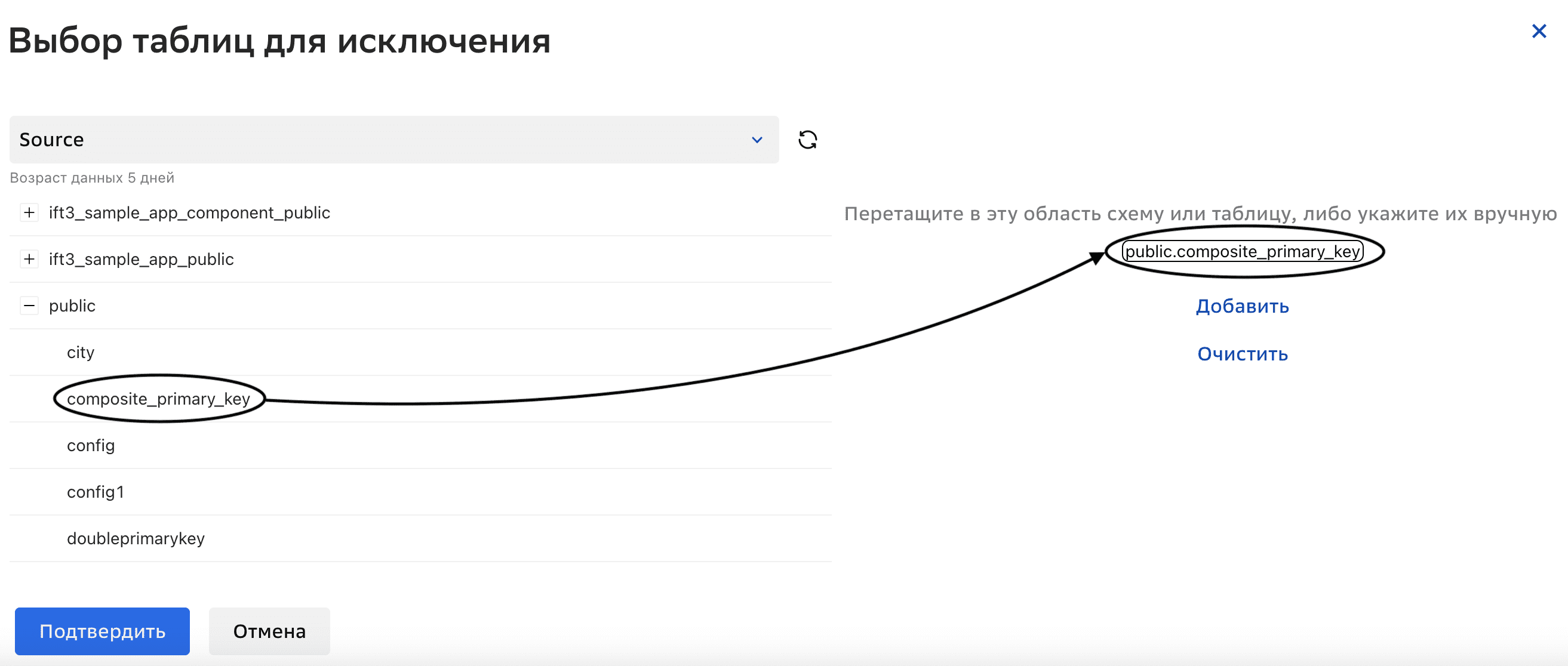 возле поля Все, кроме.Перетащите таблицы, которые не нужно реплицировать, из перечня схем слева в правую часть в открывшемся окне Выбор таблиц для исключения.