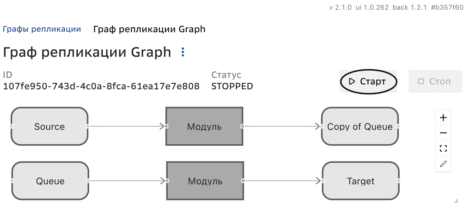 Запущенный граф: статус RUNNING рядом с названием графа в списке графов; |